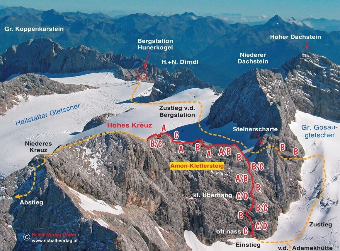 Zustieg: Von der Bergstation Dachstein Gletscherbahn bis kurz vor die Seethalerhütte, vorbei an der Steinerscharte zur Simonyscharte. Ab dort beginnen die Seilsicherungen des oberen Abschnittes des Amon Klettersteigs (C).Der komplette Amon Klettersteig kann über die Steinerscharte zum Gosauer Gletscher (ständige Spaltengefahr), absteigend bis direkt unter die Westwand, erreicht werden. Dort befindet sich der Einstieg (C/D).