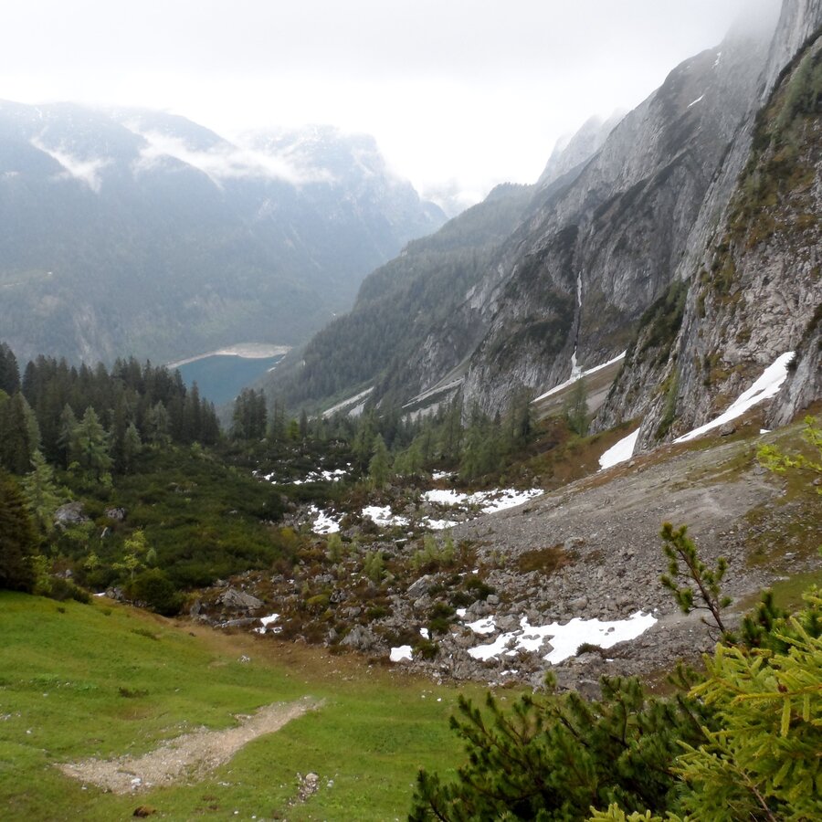 Wir starten unsere Tour am Parkplatz des vorderen Gosausees. Wir gehen auf dem Wanderweg Nr. 620 unter der Lifttrasse der Gosaukammbahn Richtung Gosausee bis wir über leichte Serpentinen die Gablonzer Hütte erreichen. Ab hier folgen wir auf Wiesenwegen weiter dem Austria Weg 611, von dem aus wir einen schönen Ausblick auf den Gosausee und auf den Törleck haben. Wir überqueren die Grenze von Oberösterreich nach Salzburg und erreichen den auf 1557 m. NN. liegenden Törlecksattel. Von hier aus gehen wir weiter auf dem Austria Weg 611 an der Südseite des Großen Donnerkogels entlang bis wir die Stuhlalm passieren. Danach geht es steil bergauf und der Weg schlängelt sich zwischen den Felsen und Latschen mit teilweiser Seilversicherung hindurch. Nachdem wir dieses Steilstück überwunden haben geht es auf einem gemächlichen Weg ein wenig Auf und Ab bis wir unser erstes Etappenziel sehen - die Hofpürglhütte.