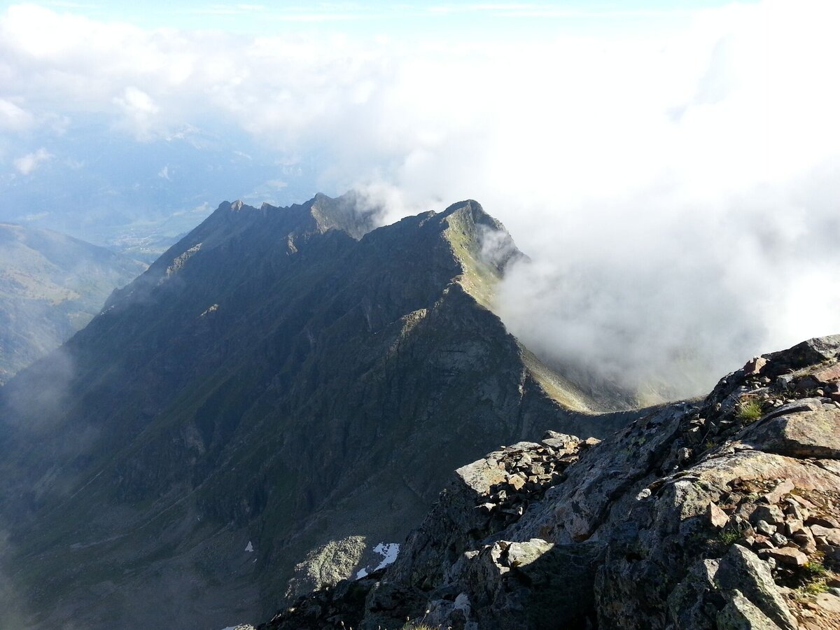 Es geht immer höher hinauf bis man über die Schrofen den kleinen Kessel der Goldlacken erreicht. Bei den Goldlacken angekommen kommt man auf den Weitwanderweg Nr. 702, der von der Breitlahnhütte kommend das kurze Stück zur Trattenscharte (2.048 m) empor leitet. Nun quert man zur Wildlochscharte, wo der Südgrat zum Gipfel der Hochwildstelle ansetzt. Von nun an beginnt der Anstieg zum Gipfel über den Blockgrat.