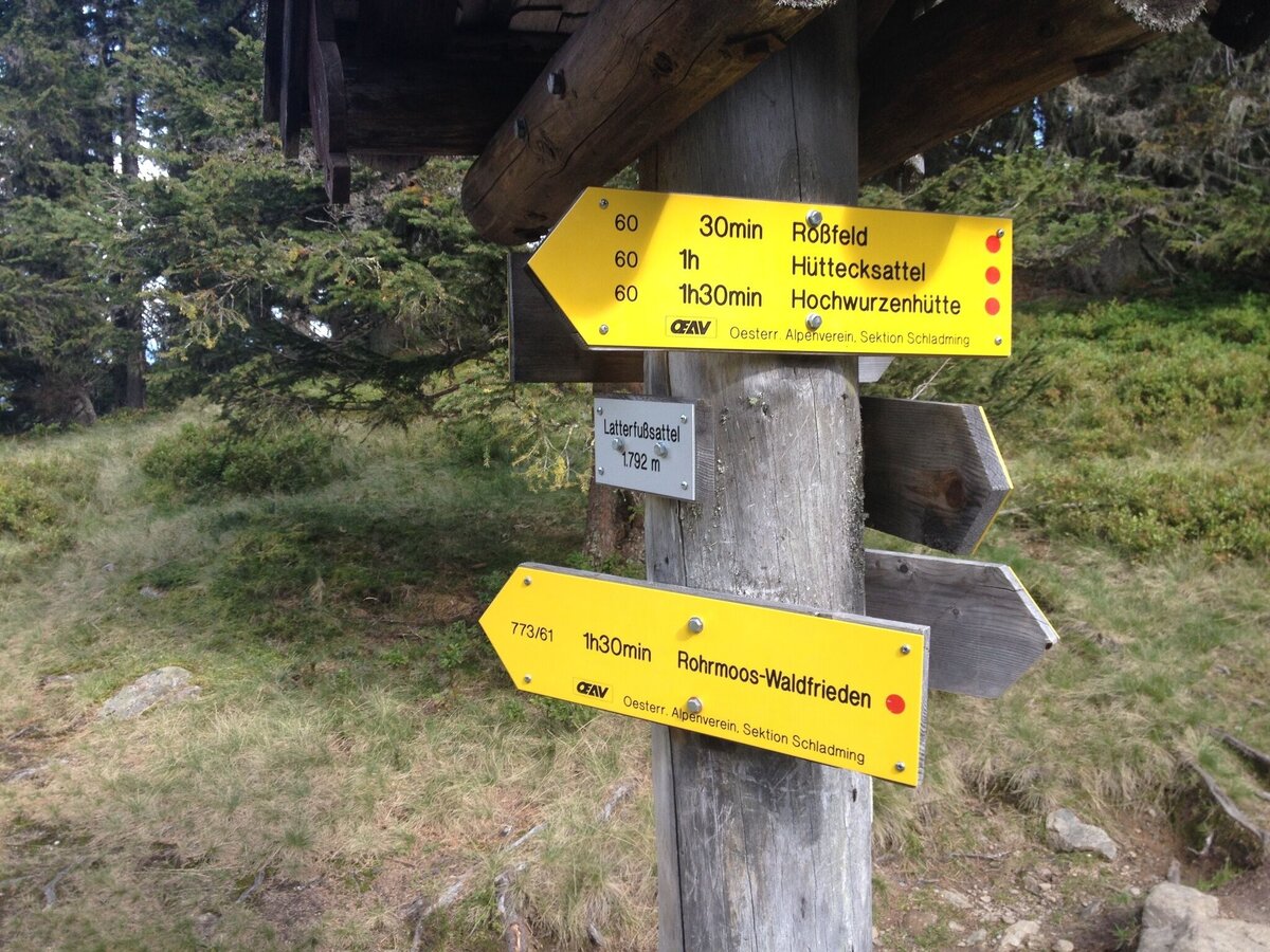 - Gleicher Rückweg bis zum Latterfußsattel und von dort Variante über den Weg Nr. 773 ins Obertal und zur Talstation der Gipfelbahn Hochwurzen (siehe Karte zu dieser Tour)