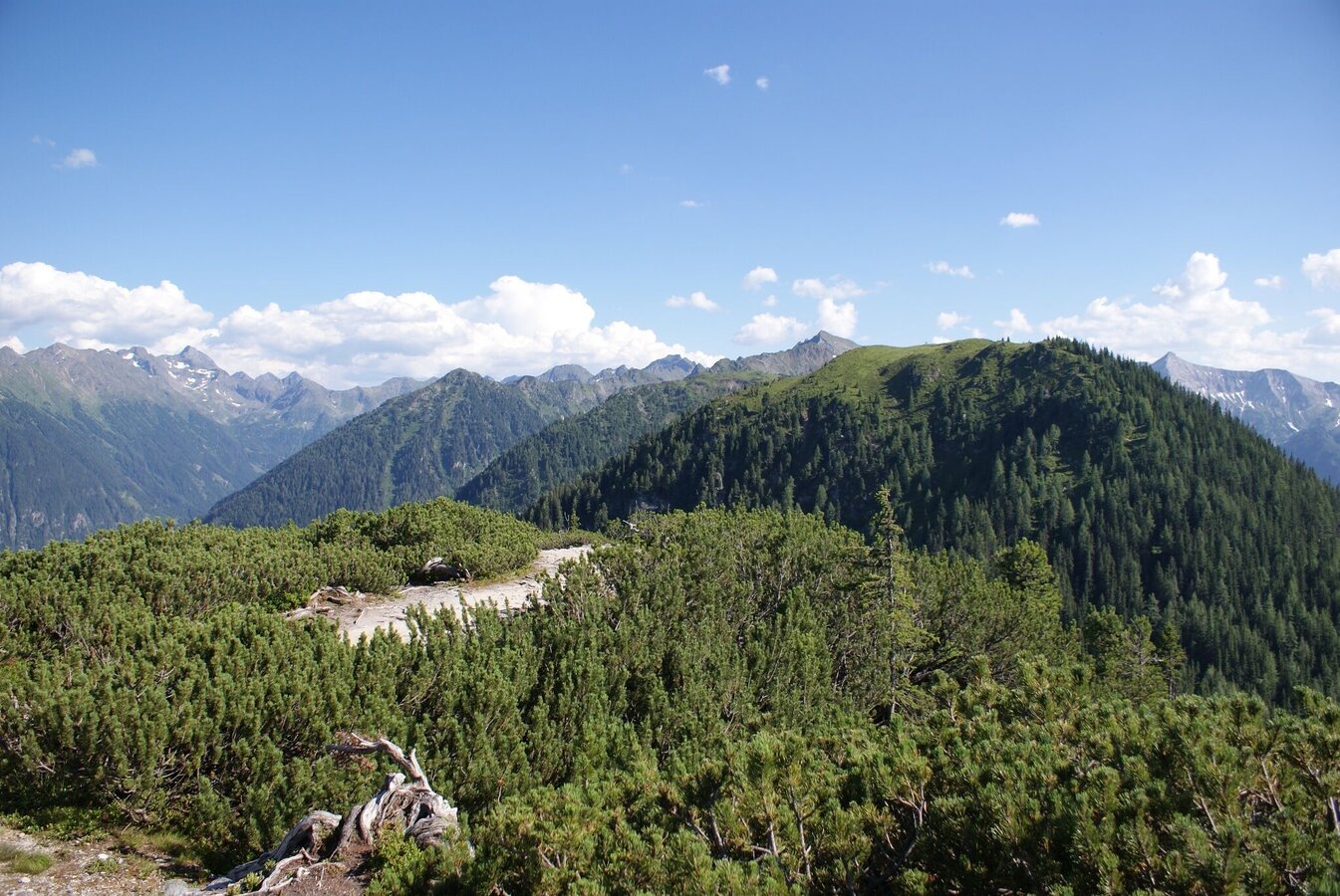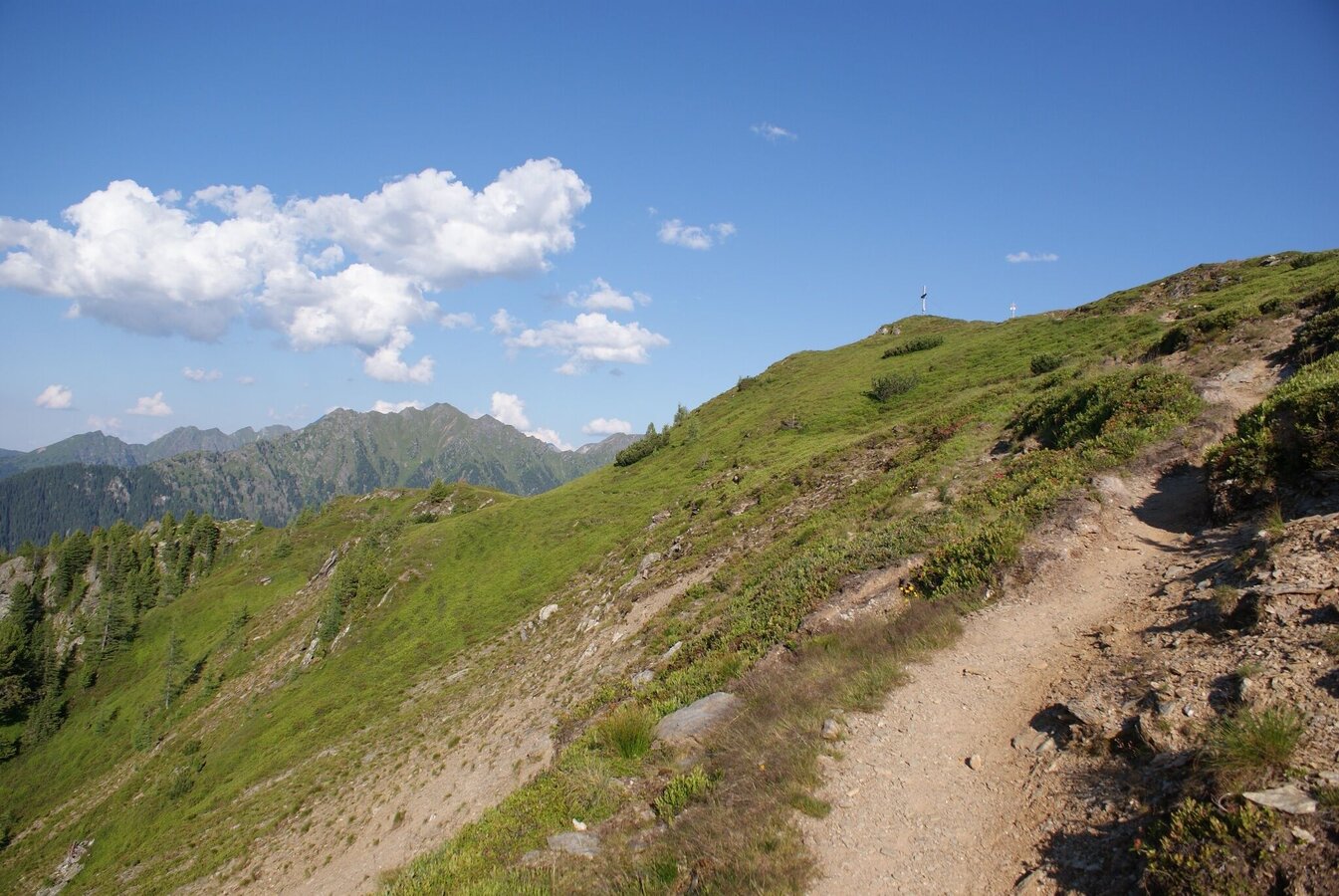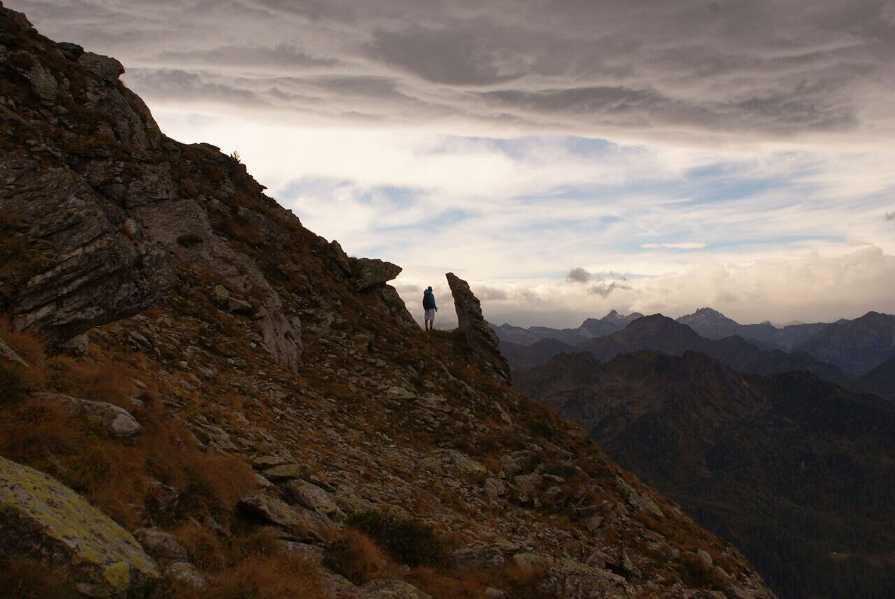 Das erste Stück führt etwas steiler oberhalb der Hütte nach oben und schon bald erreichst Du den Brettersee. Weiter bergauf wanderst Du östlich an der Kampspitze vorbei und danach oberhalb des Klammsees Richtung Schiedeck. Zuerst an der Westflanke des markanten Schiedeck, danach an der Ostflanke entlang geht es Richtung Hochfeld. Für einen eventuellen Auf- und Abstieg auf den Gipfel des Schiedeck musst Du mit zusätzlichen 45 Minuten rechnen.