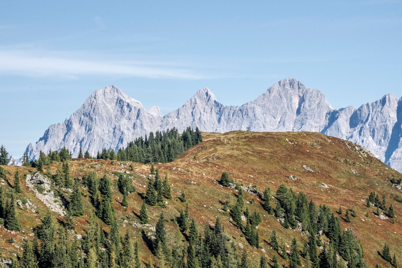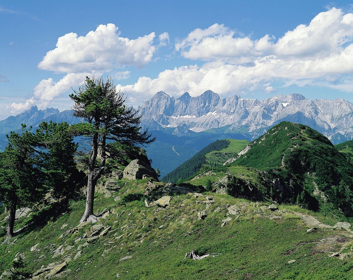 Von Schiedeck geht es weiter nordwärts - ab hier hast Du das Dachstein-Massiv ständig im Blick. Über das Hochfeld (der Umweg über den Gipfel benötigt nur ca. 10 zusätzliche Minuten) und das markante Steinmandl "Hochfeldmandl" wanderst Du über den "Latschenhügel" des Schneider weiter Richtung Guschen, wo Du eine super Aussicht auf das Obertal und Rohrmoos genießt.