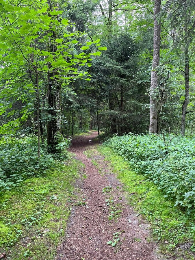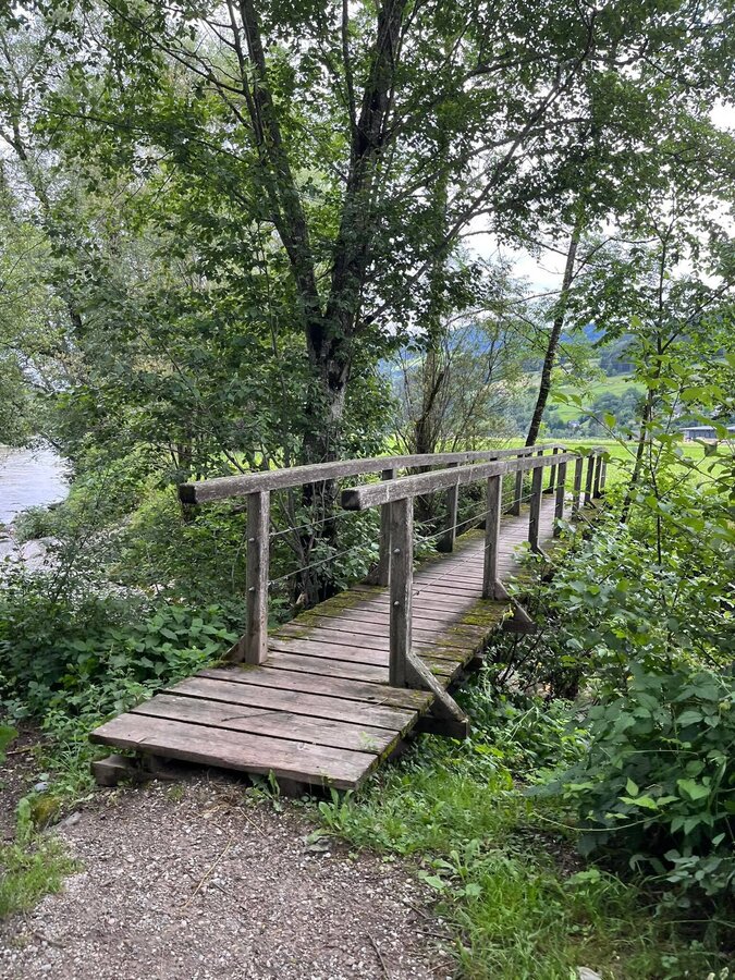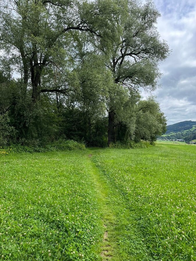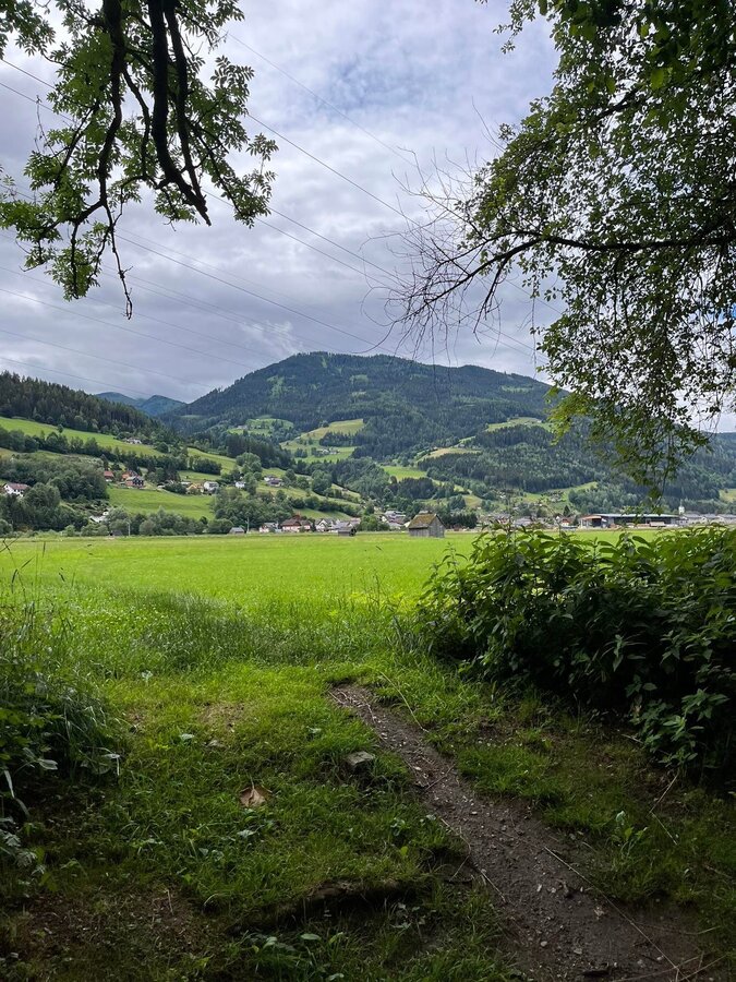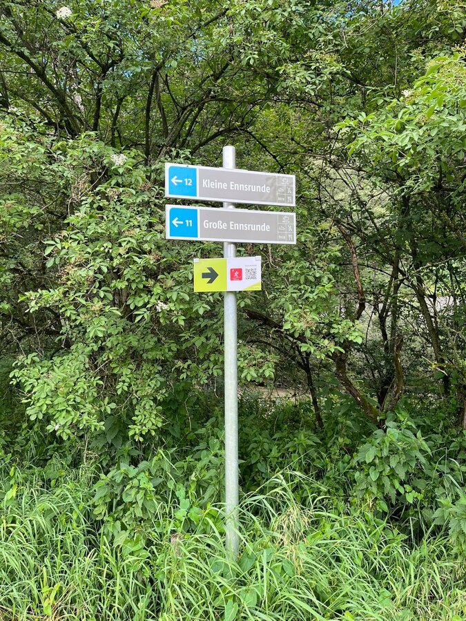 Ostsiedlung zur Bahnunterführung, rechts abbiegen und entlang der Bahn bis zur zweiten Bahnunterführung, links abbiegen zur Enns und Richtung Westen den Ennsuferweg entlang - flussaufwärts zum Steg über den Walchenbach zur Gärtnerei Thiel nach Öblarn.
