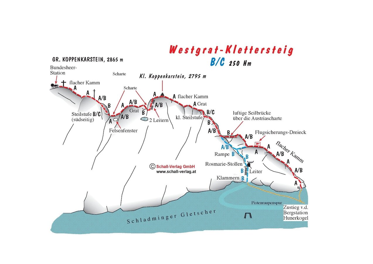 Der Kleine und Große Koppenkarstein sind sehr schöne Aussichtsberge und über den westgrad Klettersteig relativ leicht zu erreichen. Er ist auch für weniger routinierte Klettersteiggeher geeignet und verfügt über eine originelle Seilbrücke über die Austriascharte. Jedoch sollte die Höhenlage von knapp 3.000 m Seehöhe beachtet werden. Dieser Klettersteig ist auch er Abstieg des Irg 2 Klettersteigs.