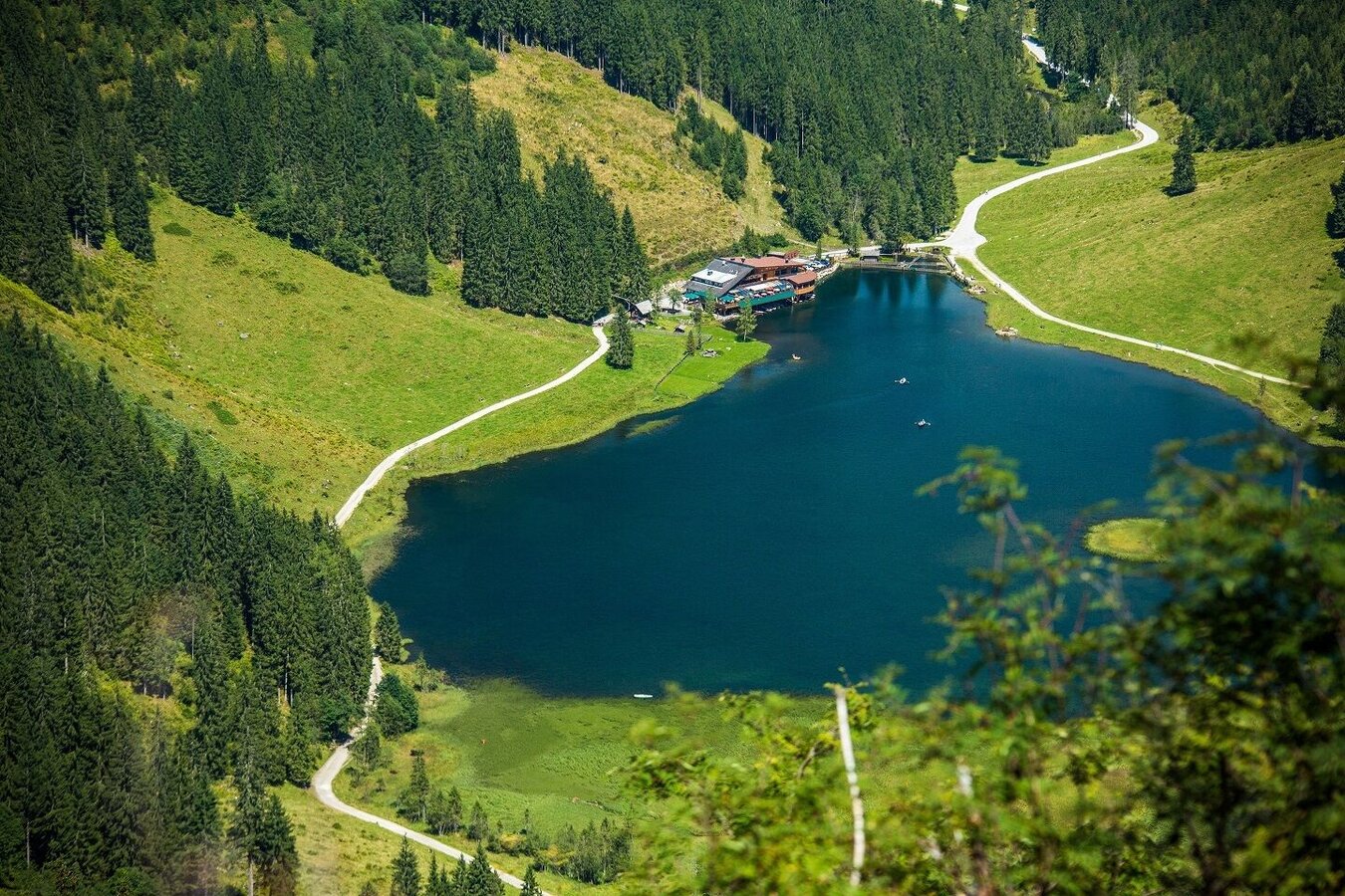 Über Ruperting bei Haus im Ennstal oder Aich/Gössenberg erreichen wir nach der Anfahrt über eine Mautstraße den Parkplatz im Seewigtal. Auf breitem Weg spazieren wir ca. 15 Minuten entlang des Baches zum Steirischen Bodensee. In rund 45 Minuten umwandern wir den See mit der Rundweg Nr. 17. Am Seeende könnten wir uns, über den Anstieg mit der Nummer 782, für eine Tour zum Wasserfall und zur Hans-Wödl-Hütte am Hüttensee entscheiden. Danach gehen wir auf der anderen Seite des Sees vorbei am Forellenhof wieder zurück zum Ausgangspunkt.