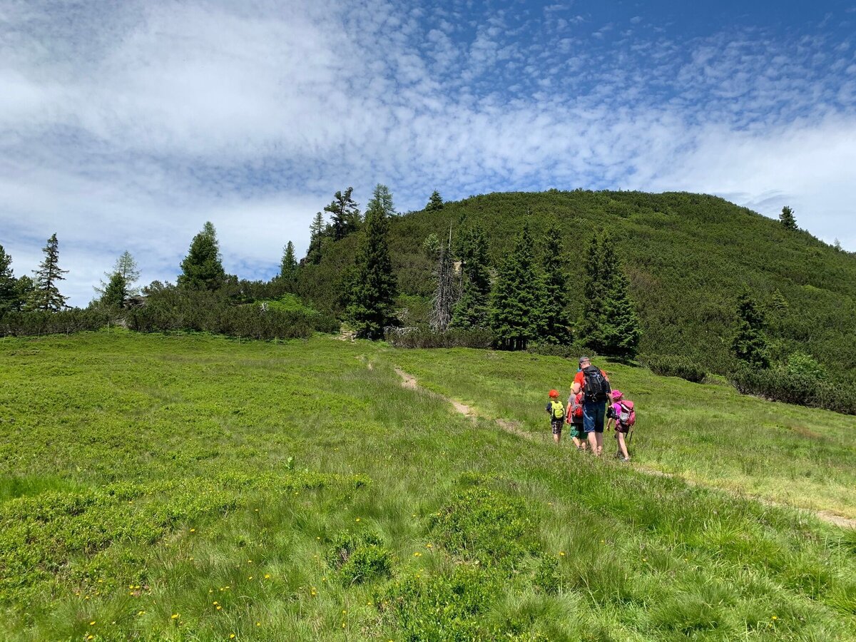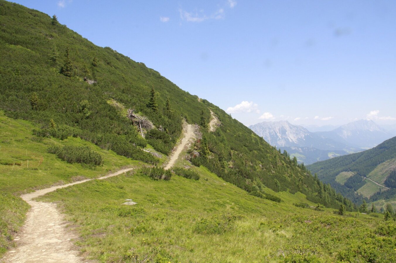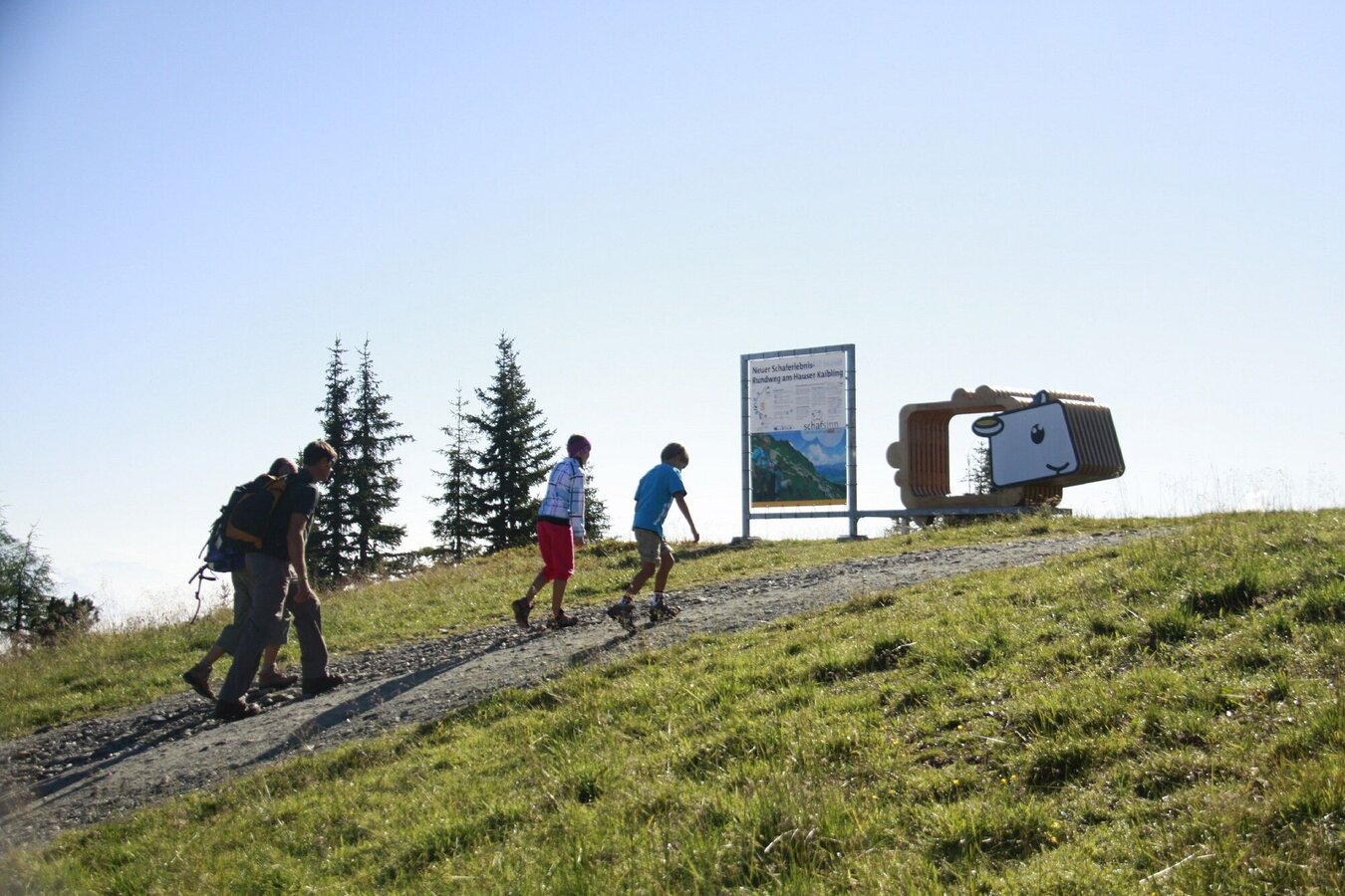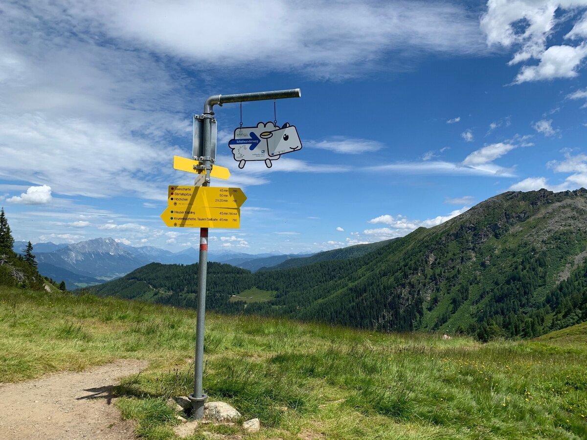 Der große Höhenunterschied kann bequem mit der Schladminger Tauernbahn oder der 8er-Gondelbahn Hauser Kaibling & der 8er-Sesselbahn Kaiblinggrat überwunden werden. Ein herrlicher Blick über das gesamte obere Ennstal erwartet uns. Von der Bergstation gehen wir einige Minuten leicht bergauf, wo der Schafsinn-Rundweg bei der TV-Station nach links in östlicher Richtung abzweigt. Dort sehen wir bald die große „Schafbox“, den eigentlichen Startpunkt des Rundweges. Dieser ist durchgehend beschildert und führt dann in leichtem Auf und Ab im Uhrzeigersinn um den Hauser Kaibling herum zum Rossfeldsattel. Von dort führt der Weg leicht abwärts zur Kaiblingalm. Diese ist für Familien mit Kinderwagen von der anderen Seite über den Forstweg, der auch zur Bergstation der Seilbahn zurückführt, gut erreichbar.