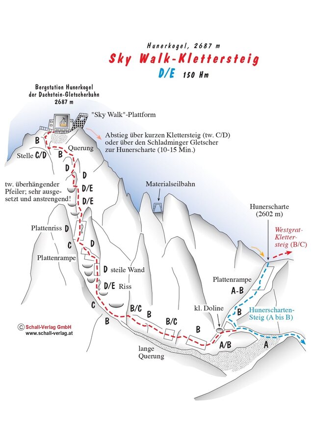 Selten ist man bei einem Klettersteig dem Himmel so nahe wie bei dem Sky Walk Klettersteig. Dieser Klettersteig gehört zu den schwersten der Ostalpen und führt nahezu in Fallinie des "Sky Walks" unwahrscheinlich exponiert und spektakulär direkt zur Bergstation der Dachstein Gletscherbahn und damit in unmittelbare Publikumsnähe - eine optimale Symbiose von Touristenattraktionen und "Super ferrata."Mehrere Passagen erreichen sogar in kurzen Abständen D/E - also extrem schwierig.