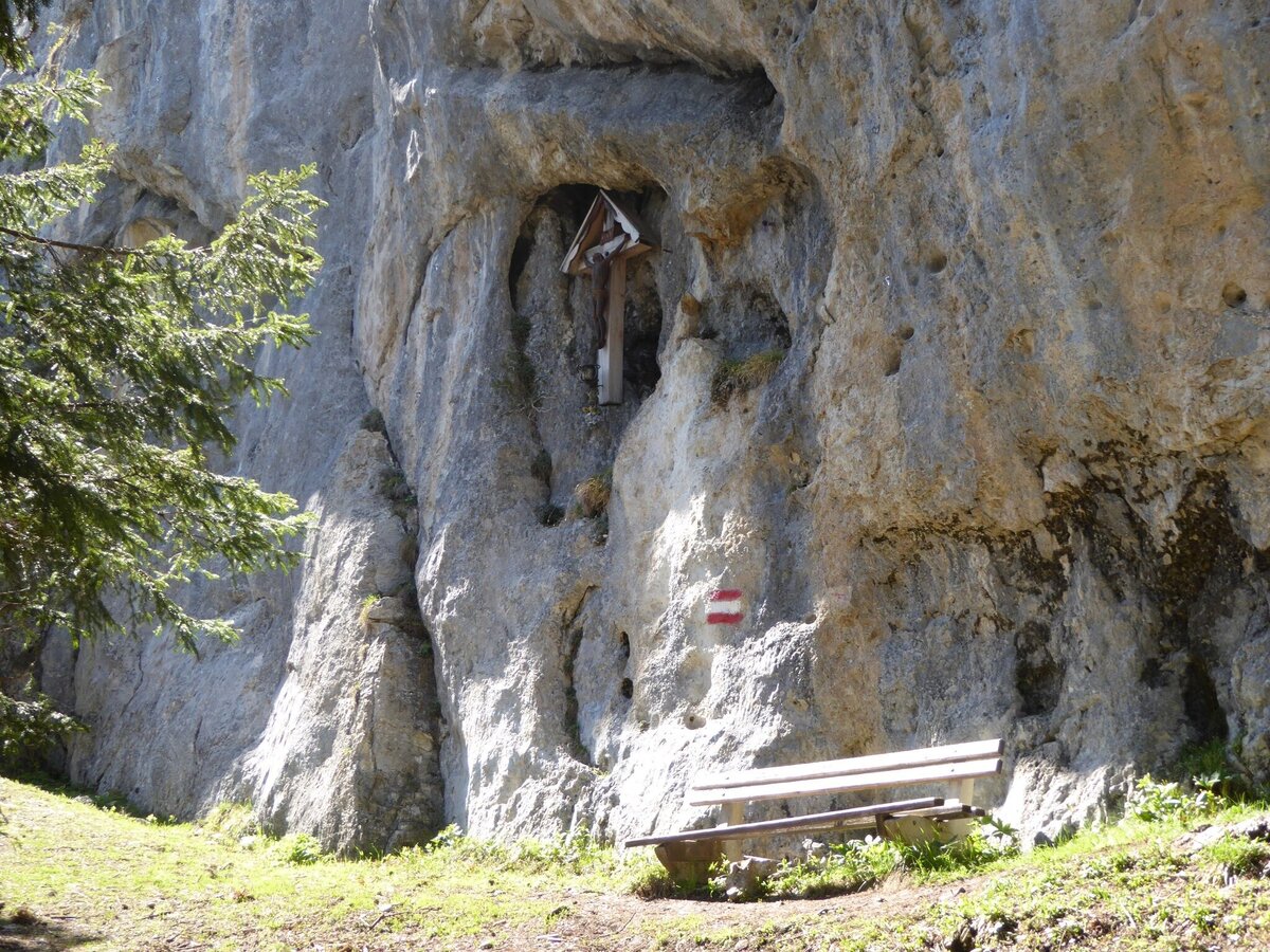 Es geht weiter bergauf vorbei am Gedankenstrich durch den Wald zum Steiner Sprung. Die Straße queren, den Weg zum Verlobungskreuz folgen und weiter zur Kaiserwand. Nach 30m rechts den alten Stoderweg bis zur Stoderhütte folgen.