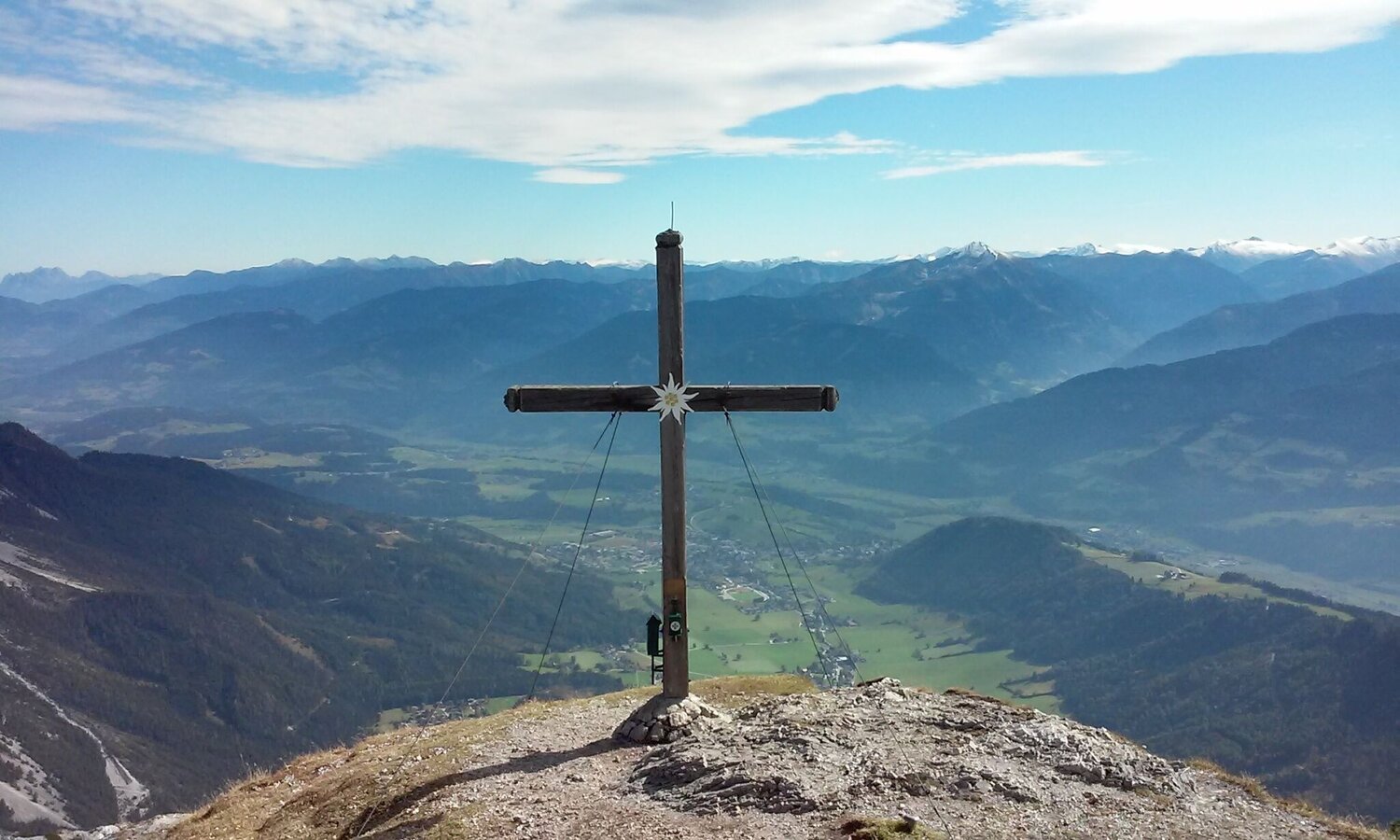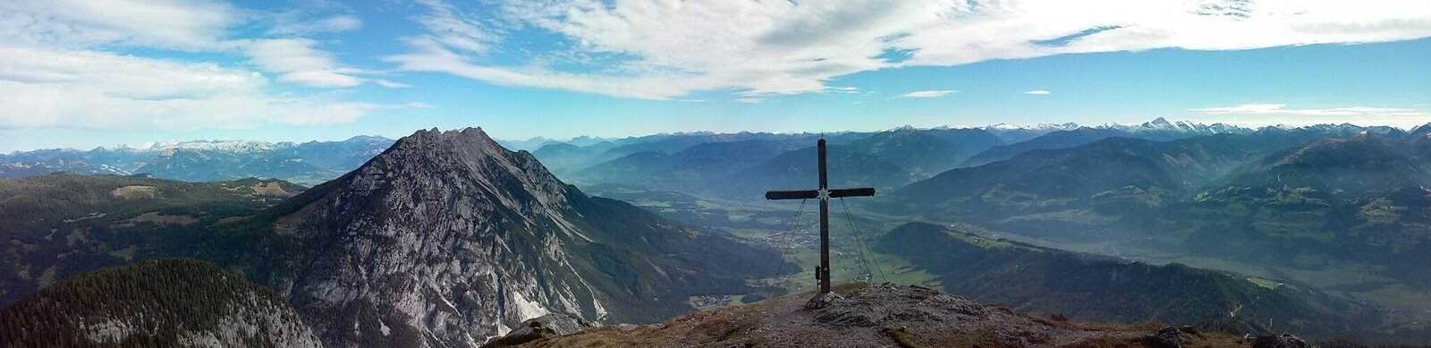 Von dort geht`s rechts leicht ansteigend hinauf bis zum Rosseggerdenkmal. Hier gibt`s dann zwei Varianten: Weiter zum Friedenskircherl und ab da nur für geübte Bergwanderer über den Florasteig zum Gipfel oder vom Rosseggerdenkmal hinauf durch den "Latschenweg" zum Gipfelkreuz Stoderzinken, wo man die herrliche Aussicht vom Dachstein bis zum Großglockner genießen kann.