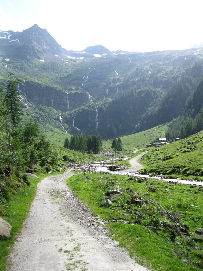 Wir bewundern Wasserfälle, die wie Schleier über die Felswände fallen und blühende Alpenrosen. Riesige Felsblöcke dienen den urigen Almhütten als Schutz.