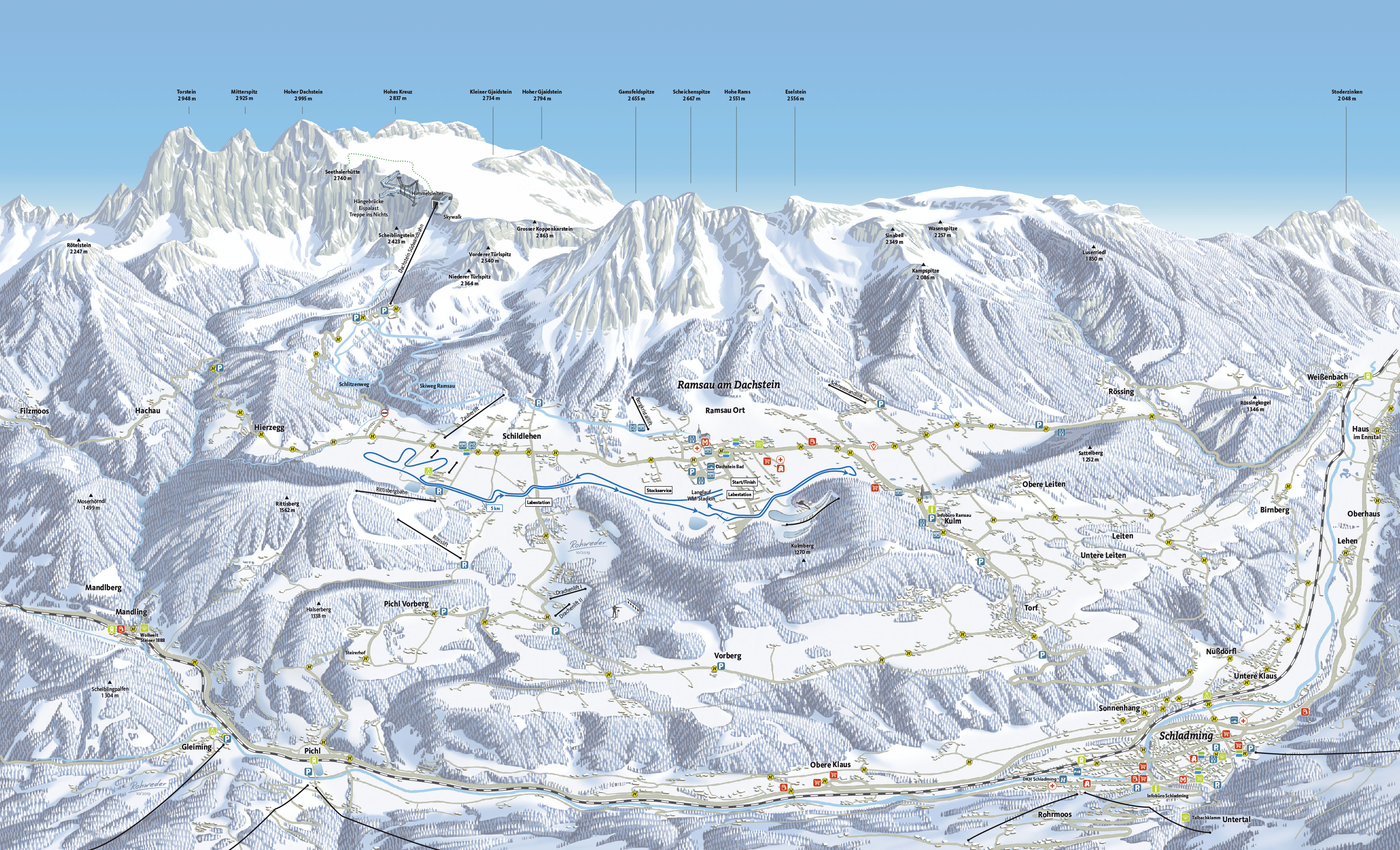 Entlang der 10km Strecke hat man immer einen herlichen Blick auf das Dachsteinmassiv. Mäßige Anstiege und schöne Gleitpassagen werden Dich auf der Loipe begleiten.