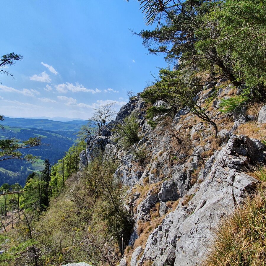 - Auf dieser Kreuzung halten wir uns nun links und zweigen auf den Weg Nr. 18b ab, der uns zur Gösser Wand führt. Achtung: nach Regenfällen ist dieser Wegabschnitt zu meiden, da Rutschgefahr besteht. Der Abschnitt oberhalb der Gösser Wand mit den beeindruckenden Ausblicken und zahlreichen Fotopunkten zählt sicherlich zu den schönsten in der Oststeiermark.