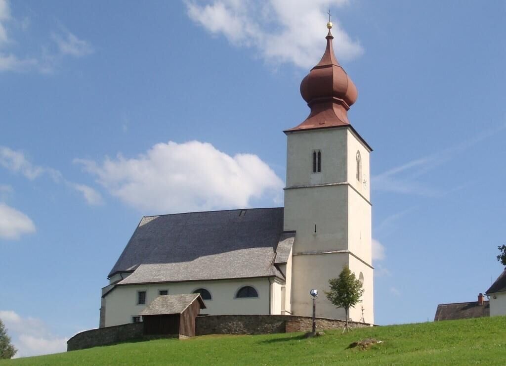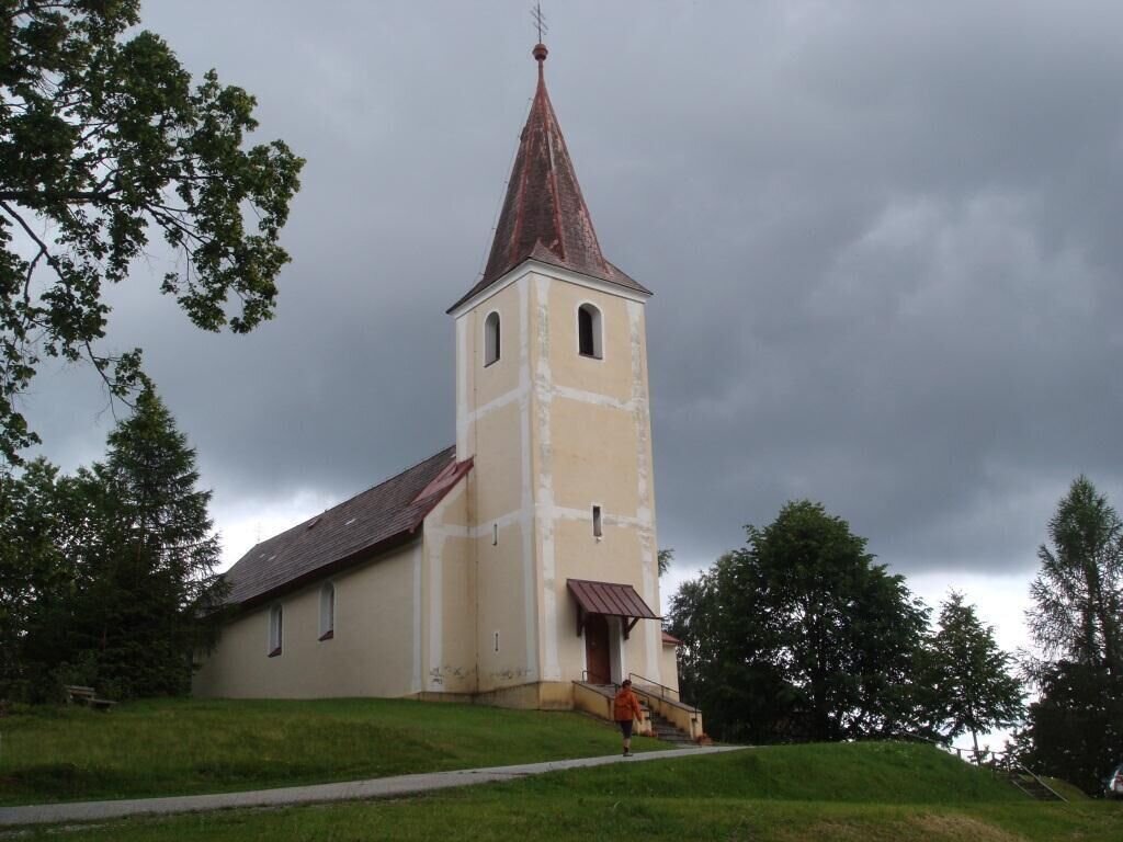 Wir verlassen den Hoiswirt in Modriach und marschieren rechts auf dem Weg 569 hinauf Richtung Schrogentor. Beim Schranken biegen wir wieder rechts ein und wandern auf Wald- und Wiesenwegen entlang bis wir auf eine Asphaltstraße treffen. Wir halten uns rechts und bleiben auf dieser Straße, bis wir zu einer Schotterstraße gelangen. Auf dieser folgen wir den Markierungen bis zum Schrogentor, gehen rechts über die Wiese hinauf und verlassen diese durch ein Gatter (Wegweiser und Markierung 551 in Richtung Freiländeralm und Hebalm). Nach ungefähr 500m biegen wir links in den Weg 568 in Richtung St. Oswald/Kloster ein, der uns direkt bis zur Kirche in diesem Ort führt. Darin ist am Altar der Hl. Jakobus dargestellt. Dieses stille Fleckchen Erde lädt uns zum Verweilen ein, bevor wir die Straße entlang zum Gasthaus Triftweber gehen.