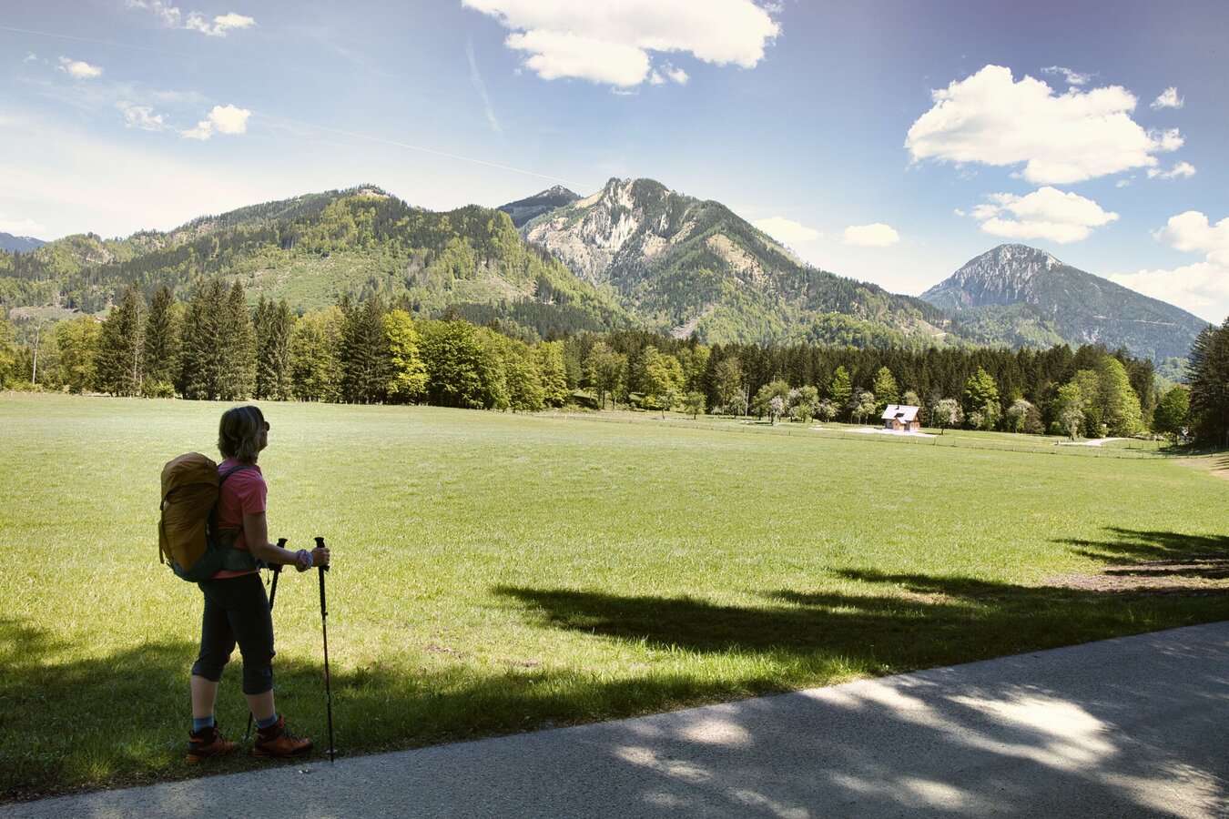 Wir starten bei der Pfarrkirche Altenmarkt und folgen zunächst dem „Weg der unSINNE“. Bei der Ennsbrücke (2,1 km) zeigt sich eindrucksvoll das tief eingeschnittene Tal der Enns mit der am Talboden liegenden Flößerkapelle. Weiter geht es am Bahnhof vorbei, über ruhige Nebenstraßen und durch stille Wälder, bis wir nach 6,4 km den Blickpunkt Enns-Schleife erreichen. Über den Standort Steinauer (7,8 km) wandern wir kontinuierlich zur Pflegeralm (10,7 km), wo sich weite Ausblicke auf die Gesäuseberge öffnen – ein weiterer Höhepunkt dieser Etappe. Nach der Alm geht es noch ein Stück bergauf entlang der Forststraße, bevor der Abstieg zur Erbstraße (14,8 km) führt. Hier halten wir uns links und gelangen mit leichtem Anstieg zur Dienerhöhe (15,9 km). Auf Nebenstraßen wandern wir weiter – stets mit Blick auf die markante Burgruine Gallenstein. Nach dem Abstecher auf die Burgruine (17,8 km) führt der Weg hinunter in den naturbelassenen Zinkgraben (19,2 km), dessen Ursprünglichkeit den stimmungsvollen Abschluss bildet. Über einen kurzen Gegenanstieg erreichen wir das Ortsgebiet von St. Gallen und beenden die Etappe bei der Pfarrkirche St. Gallen (19,8 km).