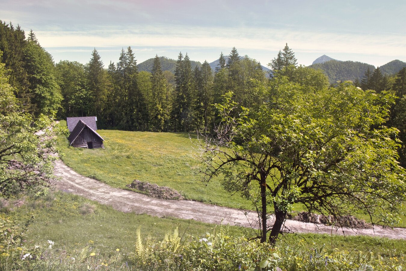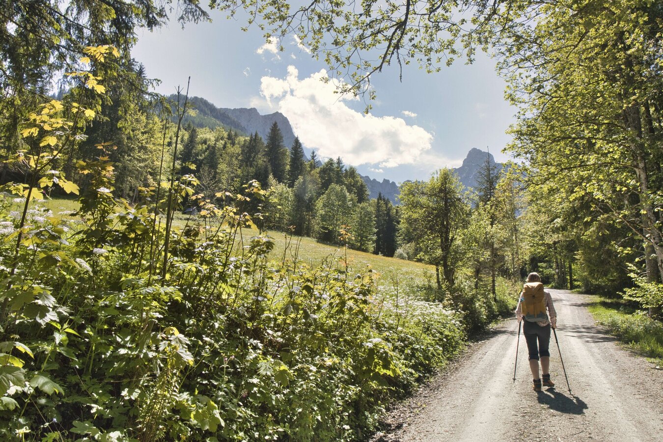 Wir starten bei der Pfarrkirche St. Gallen, gehen durch den Ort zur Nussabrücke und weiter auf Nebenstraßen zur bereits bekannten Dienerhöhe (1,8 km). Von hier führt der Weg stetig ansteigend über eine Forststraße zur aussichtsreichen Stockingeralm (5,0 km) und noch ein Stück weiter bergauf bis zum Finsterbachriedl auf 990 Metern. Anschließend wandern wir gemütlich bergab durch den Schindelgraben, bis wir nach insgesamt knapp 11 Kilometern die Erbstraße erreichen. Wir folgen der Landesstraße bergauf bis zum Erbsattel und zweigen wenig später rechts zum Schloss Kassegg (12,4 km) ab. Das ehemalige Jagdschloss mit seinem weitläufigen Park lädt zu einer kurzen Rast ein. Danach geht es zunächst bergab entlang der Landesstraße, bevor wir rechts in den Mühlbachgraben einbiegen. Die Forststraße geht letztendlich in einen Steig über, der teilweise etwas steiler hinauf zum Bärensattel (18,8 km) führt. Mit Blick auf markante Felswände wandern wir das letzte Stück bergauf und erreichen schließlich die Ennstaler Hütte (19,7 km) – die älteste Schutzhütte im Gesäuse und Ziel dieser Etappe.