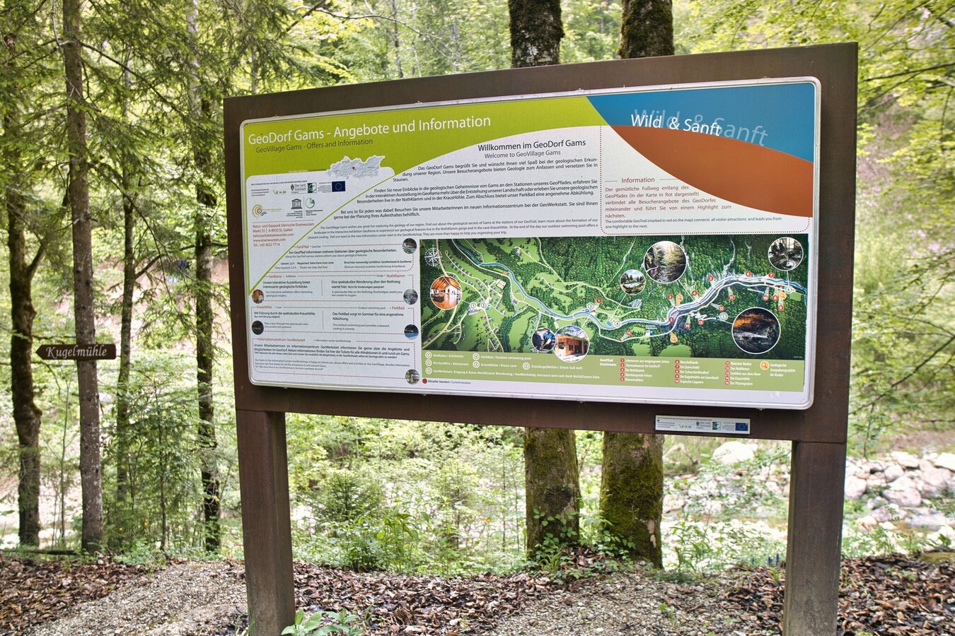 einzelnen Häusern erreichen wir den Parkplatz mit Infotafel zum GeoDorf Gams
