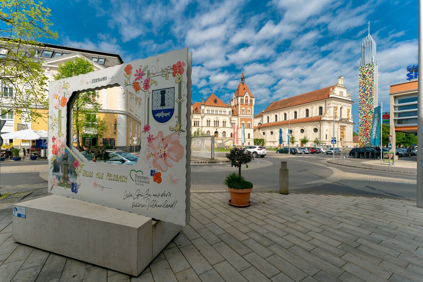 Ein letzter Stopp: der Fotopoint mit der großen Feldbach-Postkarte als Erinnerungsmotiv.
