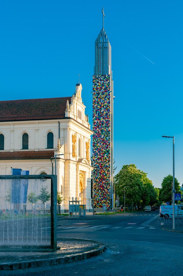 Start beim buntesten Kirchturm der Welt (1) – dem farbenfrohen Wahrzeichen Feldbachs. Direkt dahinter befindet sich das Heimat.Museum im Tabor sowie der Dekalogweg.