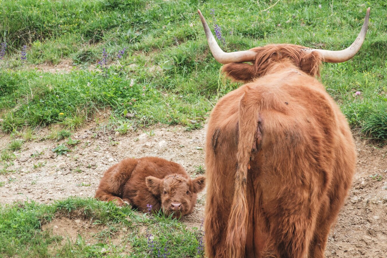 Auf einer leicht ansteigenden Straße kommt man an Wiesen, Feldern und historischen Bauwerken vorbei. An der Gabelung, an der der Friedhofweg auf den Forstbauerweg trifft, geht es rechts weiter und an der nächsten geradeaus. Der weiteren Beschilderung folgend, führt die Route an einem Spielplatz und mehreren Rastbänken vorbei zu einer Wiese mit Hochlandrindern.