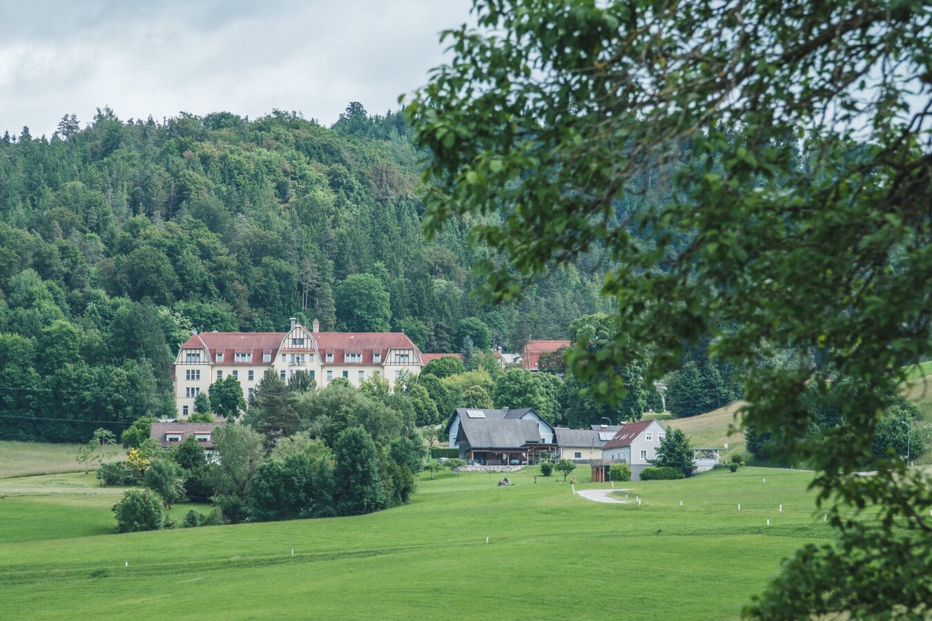 Während der Kinderrechteweg rechts weiter verläuft, führt der Kultur- und Naturwanderweg nach links weiter. Nach etwa fünfzehn Minuten ist das Ziel, das Landeskrankenhaus Enzenbach, erreicht.