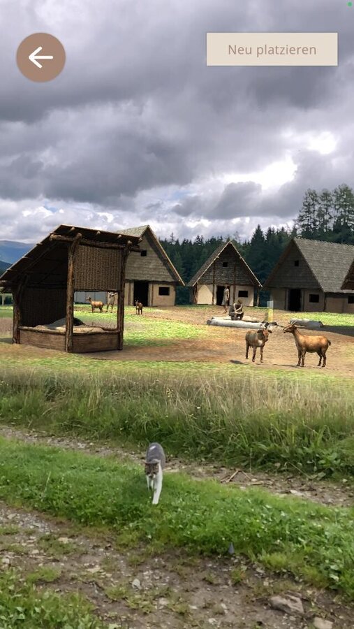 Wenn wir vor der Informationstafel von "Sagenhafte Landschaften" stehen, gehen wir gerade aus und biegen nach rechts ab. Die Straße führt uns zur Mostschenke Moorstüberl, welche in den Sommermonaten auch bewirtschaftet ist. Einige Meter danach machen wir mit digitaler Unterstützung eine Zeitreise in die Bronzezeit und können ein über 3.000 Jahre altes Dorf wieder zum Leben erwecken.