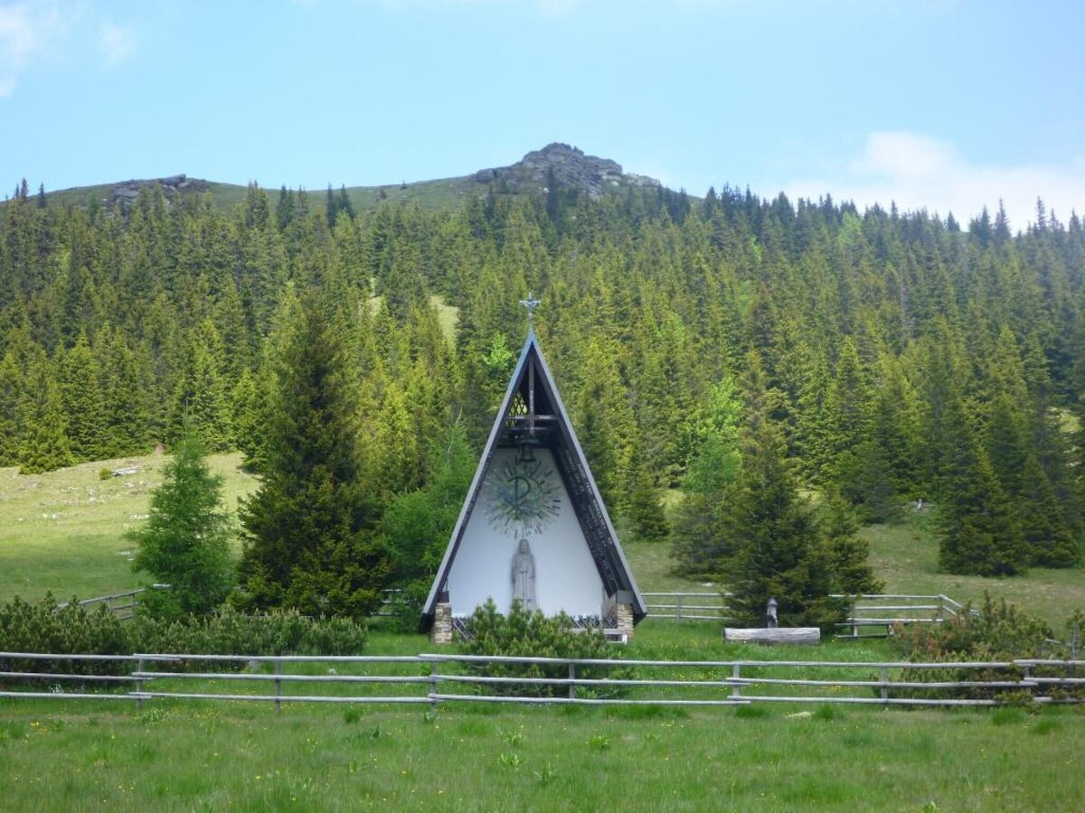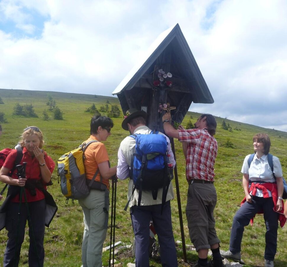Nach kurzer Rast marschieren wir weiter am Weg 553 in Richtung Poschalm. Vorbei an der Jagdhütte mit dem schwarzen Herrgott gehen wir sofort nach der Scheune links und folgen dem Wegverlauf bis zum Kreuzungspunkt Wildbachsattel-Glashütten. Dem Wegweiser Jakobsweg und Weg 578b folgend, gehen wir steil bergauf durch den Wald in Richtung Handhöhkreuz Weinebene. Beim Handhöhkreuz folgen wir wieder der Markierung bis wir zur von Carl Hermanns geschaffenen Pauluskapelle bei der Passhöhe Weinebene ankommen. Nach diesem anstrengendem Anstieg ist es wichtig bei einer Rast innezuhalten und unsere Kräfte für den Aufstieg zum Koralpenspeik zu sammeln.