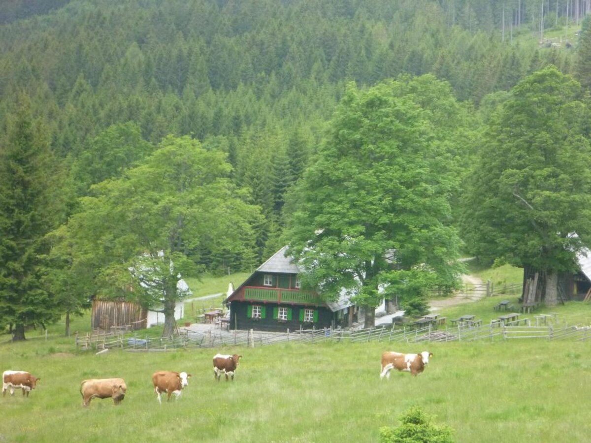 Wir verlassen diesen idyllischen Wallfahrtsort und in Richtung Kirche am Weg 553 und kommen an Volksschule und Gemeindeamt vorbei. 150m nach der Kirche nehmen wir links einen Weg durch den Wald und treffen knapp vor dem Fußballplatz wieder auf die Straße. 100m danach sehen wir auf der linken Seite beim Gatter die Straßenabzweigung zur Trahüttner Hütte. Wir bleiben am landschaftlich reizvolleren Wanderweg 553 – nach 300m beim Bauernhof gehen wir zwischen Garage und Hof durch und folgen der Markierung durch Wald und Wiesen bis zur Trahüttner Hütte auf 1.317m Seehöhe. Die Gehzeit von Osterwitz bis zur Hütte ist ungefähr 1 Stunde.