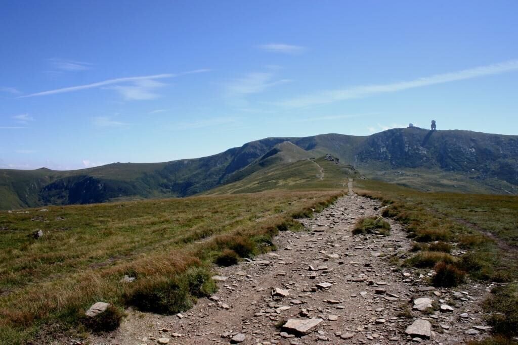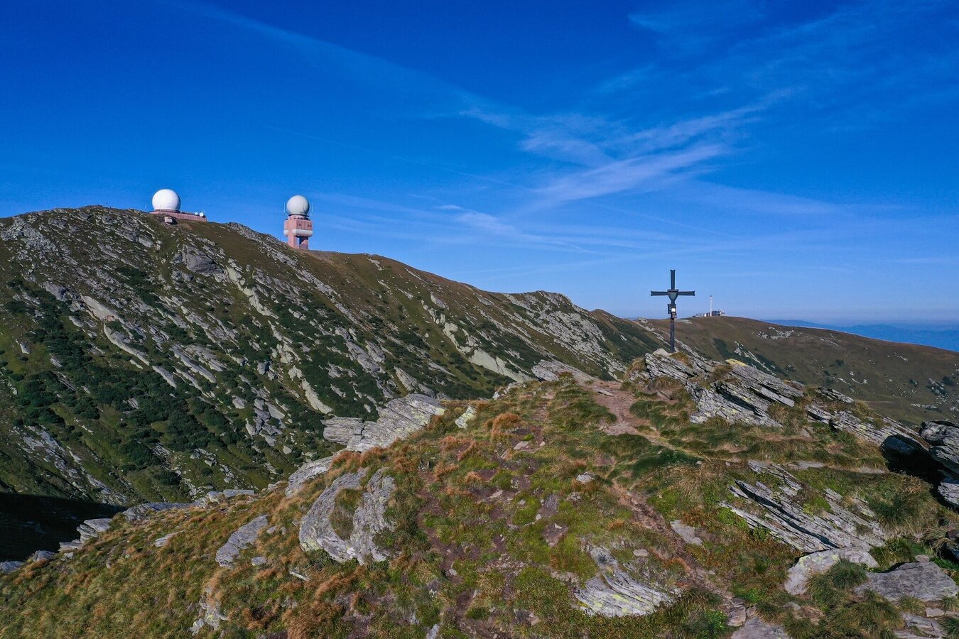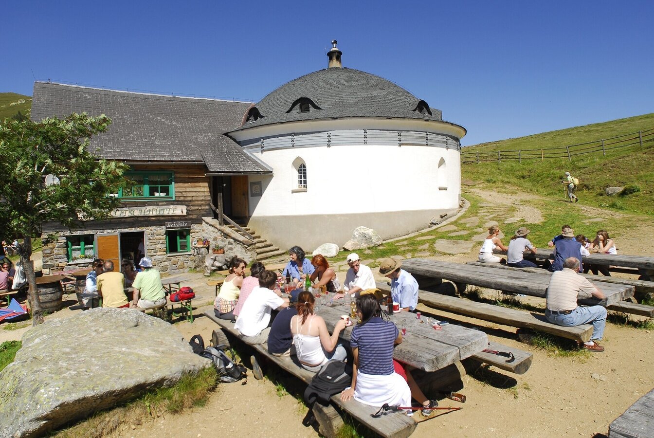 Von der Weinebene folgen wir dem Weitwanderweg 505, wir gehen links am GH Pichler Alm in Richtung Hühnerstütze und Grillitschhütte und genießen das malerische Panorama der steirisch/kärntnerischen Bergwelt. Leicht ansteigend pilgern wir auf der Schotterstraße entlang der Brandhöhe und des Moschkogels bis hinunter zur Abzweigung „Grillitschhütte.“ Wir halten uns links und gehen steil bergauf über die „Hühnerstütze“ (1.979m). Am Grad entlang wandernd, sehen wir rechts unten das Große Kar und vor uns erblicken wir erstmals das Gipfelkreuz vom Koralpenspeik auf 2.140m Seehöhe mit den Goldhauben. (Die "Goldhaube" ist eine Radarstation des Bundesheeres und dient der Überwachung des Luftraumes). Seitlich vorbei, entlang des Seespitzes stetig bergauf, gelangen wir zum höchsten Punkt des Jakobsweges auf 2.140m Seehöhe, dem Gipfelkreuz des Koralpenspeiks. Bei klaren Wetterverhältnissen genießen wir die prächtige Aussicht auf die steirische und kärntnerische Bergwelt. Danach folgt nur mehr ein kurzer Abstieg am Weg 505 zum gelegenen Koralpen-Schutzhaus (1.966m). Wir haben das Ziel der 6. Etappe erreicht.