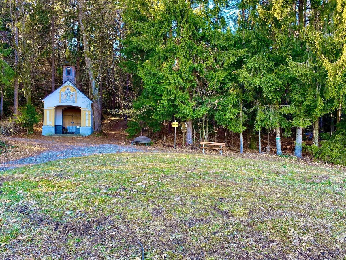 Voller Tatendrang wandern Sie nordwärts am Gehsteig der Landesstraße weiter, gehen am Buschenschank Achatz vorbei und kommen bald zur Straße nach Langegg. In der Straßengabel laden Bänke zum Verweilen ein und Sie sollten sich die Zeit nehmen die Infotafeln und Wegweiser zu studieren. Wer gleich zum Buschenschank-Hotspot von Langegg gehen möchte, nimmt die Straße rechts. Sie sollten sich den schönen Ausblick von der Kraxnerkapelle nicht entgehen lassen. Daher halten Sie sich an den Wegweiser S10/11G. Nach einigen Metern auf der Landstraße biegen Sie nach rechts hinauf ab zur Kapelle. Die beeindruckende Kraxnerkapelle, die im Jahr 1860 erbaut wurde, steht am Waldrand und ist mit wunderschönen Figuren ausgestattet. Ein gemütlicher Platz im Schatten zum Verweilen. Hier, am höchsten Punkt der Tour auf 646 Metern Seehöhe, genießen Sie im Schatten alter Waldbäume das Panorama hoch über den Dächern und Weingärten von Langegg und Ihr Blick reicht vom Schöckl bis zum Demmerkogel. Wenn Sie die Möglichkeit haben ein Fernglas auf die Tour mitzunehmen, werden Sie es hier zu schätzen wissen.