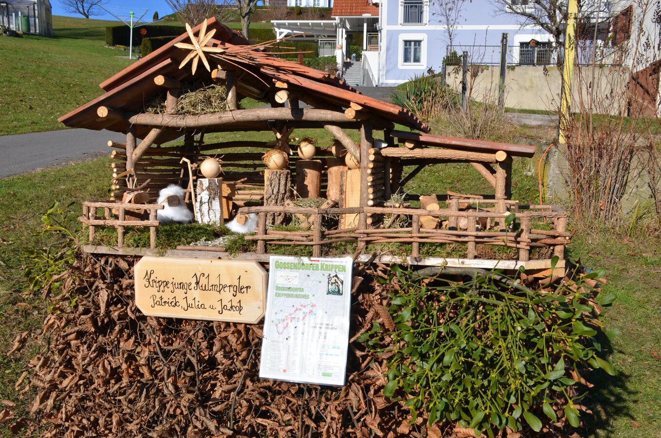 Dem hektischen Alltag entfliehen und sich an liebevoll gestalteten Krippen erfreuen, das ist in Gossendorf möglich, wenn der Ort im Advent zum Krippendorf wird. Entlang des rund fünf Kilometer langen Rundweges weisen Sterne den Weg zu den von Privatpersonen und Familien individuell gestalteten rund 60 Krippen Krippen. Jede Krippe ist einzigartig und oftmals aus reinen Naturmaterialien hergestellt. Ebenso können eine Stallkrippe mit lebendigen Tieren oder auch eine Weinhofkrippe bestaunt werden. Mit der Geo-Caching-Krippe gibt es in Gossendorf ein weiteres Unikat – diese kann nach erfolgreicher Suche mit adäquaten Utensilien erweitert werden.