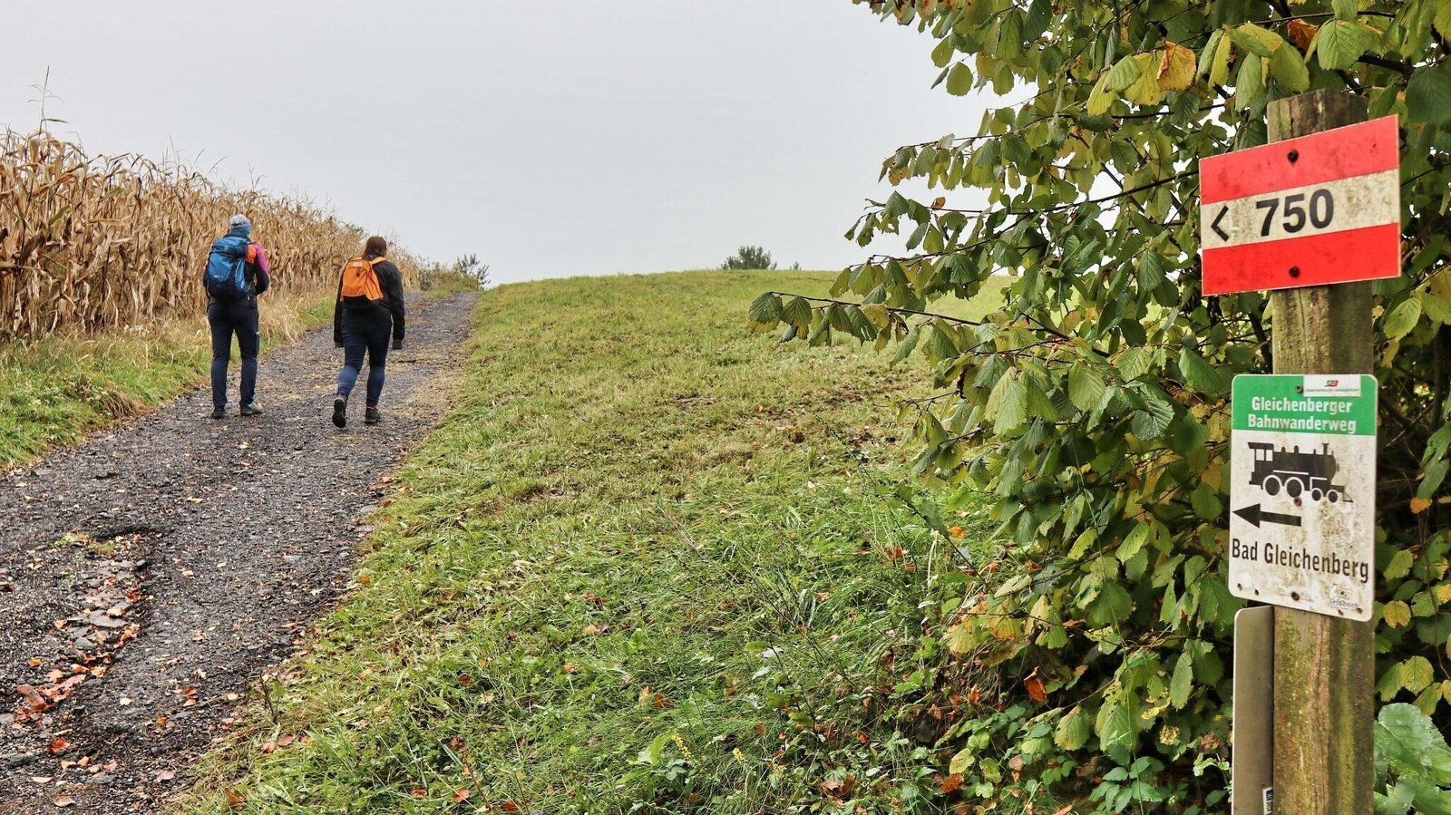 Wir starten beim ÖBB-Bahnhof in Feldbach gehen über die Raabbrücke in Richtung Zentrum. Am Ende des Hauptplatzes halten wir uns rechts und passieren das Grazer Tor. Auf der rechten Straßenseite bleibend sehen wir bei einem Zebrastreifen die Beschilderung für den „Gleichenberger Bahnwanderweg“. Hier gehen wir nach links, die Ottokar-Kernstock-Straße entlang, bis wir uns bei einer Kreuzung rechts halten und in Richtung Kalvarienberg weiterwandern. Beim Krankenhaus vorbei, folgen wir nun der Straße leicht bergauf, bis wir links eine gelbe Tafel „Auf den Spuren der Vulkane“ sehen, die den Einstieg in den Kalvarienbergweg weist. Nun noch die Stationen bergauf und wir erreichen den Kalvarienberg. Von hier aus haben wir einen schönen Ausblick auf Feldbach und können in der Ferne die Riegersburg erkennen. Nach der kurzen Pause wandern wir leicht bergab, kommen bei einem Selbstbedienungskühlschrank vorbei und folgen nun der Straße, die durch das wenig besiedelte Gebiet und in Folge durch den Wald führt. Bei den Straßenkreuzungen achten wir auf den gut beschilderten Weg. Kurz nach einer Straßenkreuzung zweigt der Wanderweg nach links auf einen Feldweg ab. Ab hier verlassen wir die Asphaltstraße und wandern parallel zu den Gleisen, bis wir die Haltestelle Prädiberg erreichen. Von der Haltestelle geht es ein Stück entlang der Asphaltstraße, bis wir links die Abzweigung in den Wald sehen. Der Wanderweg ist deutlich markiert und so überqueren wir mehrmals die Gleise und erreichen die Haltestellen Fischa und Burgfried. Kurz nach der Bahn-Haltestelle Burgfried verlassen wir die Gleise und wandern über Flur- und Waldwege bergab nach Maierdorf. Nach dem Ortsende zweigen wir links in Richtung Ludersdorf ab und gehen nach ca. 300 m rechts bergauf, um kurz darauf die Gleise zu überqueren und der Straße bergauf zu folgen. Nachdem wir die Anhöhe bei Hochegg erreicht haben, geht es entlang der Straße leicht bergab, bis zur Abzweigung auf der rechten Seite mit der Aufschrift „Bahntrassenweg – Nur bei Schönwetter“ Der etwas längere Weg führt über die Haltestelle Hofstätten und kommt nach der Haltestelle Trautmannsdorf wieder zum „Sommerweg“ hinzu. Dieser „Sommerweg“ ist zu empfehlen, da wir durch schöne Buchenwälder und über Wiesenflächen bis nach Trautmannsdorf. Die Straße entlang geht es nun wieder leicht bergauf, bis wir zu einem Wartehäuschen kommen. Hier erreichen wir wieder den „Normalweg“ und gehen rechts beim Wartehäuschen vorbei, die Reserlstraße entlang, beim Buschenschank Leitgeb vorbei und in Folge durch den Wald, bis wir den Hohe-Warte-Weg erreichen. Ab nun wandern wir durch das besiedelte Gebeit bergab, bis wir zum Kreisverkehr am Talboden kommen. Wir gehen geradeaus und nach kurzer Zeit halten wir uns links und sehen den Bahnhof Bad Gleichenberg bereits vor uns.