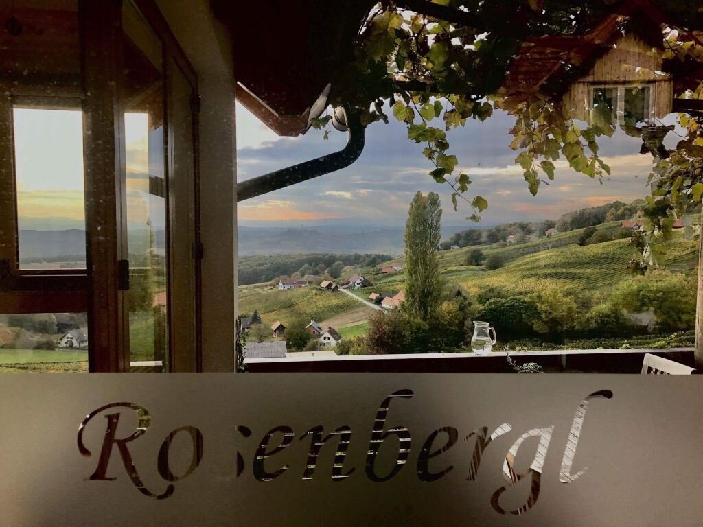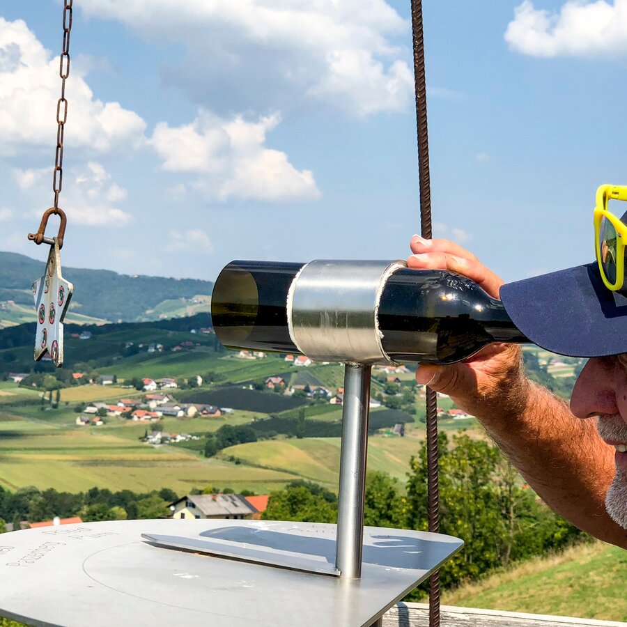Nach knapp 2 km verlassen wir den Wald und gelangen zur Aussichtswarte Frutten-Gießelsdorf, die uns ein wunderschönes Panorama auf die umliegenden Weingärten bietet. Hier treffen wir auch auf den Weinweg der Sinne, der bis nach St. Anna am Aigen mit seiner Gesamtsteirischen Vinothek führt. Wir jedoch halten uns weiter geradeaus und genießen den Weg und die Panoramablicke in den idyllisch gelegenen Weingärten am Rosenberg, die wir nun durchwandern.