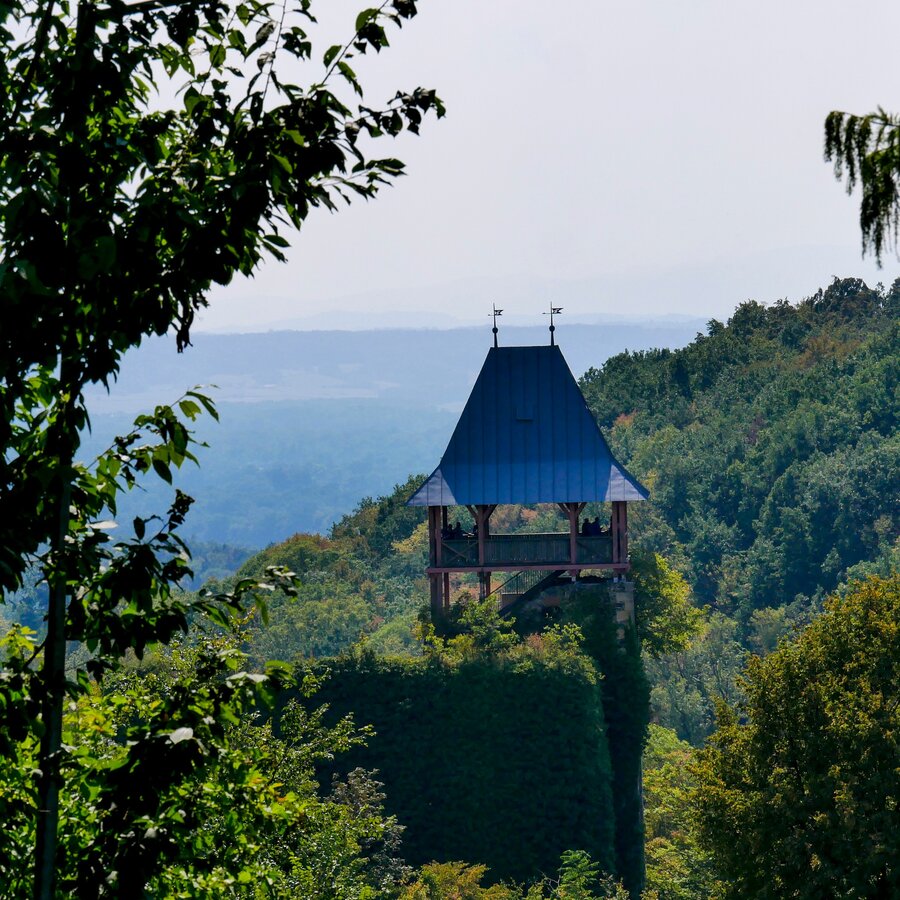 Der nächste Abschnitt unserer Tour - bevor es zum Abschluss nach Bad Radkersburg geht - nach Klöch ist gesäumt von kleineren und größeren Aussichtswarten, wobei die größte und imposanteste sicherlich jene bei der Burgruine Klöch am Ende der Wanderung ist. Der Aussichtsturm der Klöcher Burgruine bietet eine wunderschönen Ausblick auf die hügelige Weinlandschaft im Südosten der Steiermark und das angrenzende Ungarn und Slowenien. Die Burgruine wurde 1998 renoviert und wird auch für Kulturveranstaltungen wie etwa Theateraufführungen, Konzerte oder Lesungen genutzt. Die Burgruine kann auch als Eingangstor zu Klöch gesehen werden. Nur wenige Meter ist es nun noch bis zum wunderschönen Dorfplatz, wo wir auch rechter Hand beim Pfarramt vorbei die Vinothek und das Weinbaumuseum vorfinden.