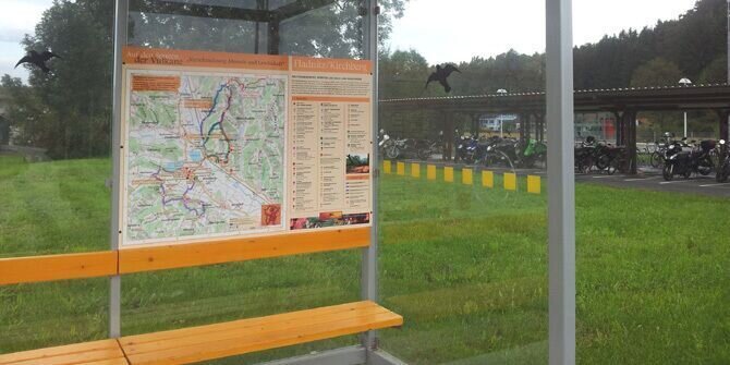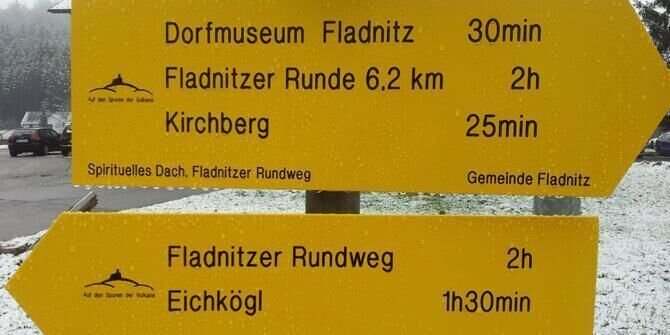 Ausgehend vom Bahnhof in Fladnitz-Studenzen unterstützt ein Infopoint den Einstieg in den Rundweg. Es geht links in Richtung Raabtalhof und dann weiter über die Bahnübersetzung. An der nächsten Hausecke weisen die gelben Schilder den Weg. Auf der Ebene geht es östlich bis zum Dorfmuseum, dann hinauf auf den Fladnitzberg. Ein kleiner Weg durch den Wald und am Ausgang eröffnet sich ein netter Rastplatz - das Schellauf Marterl. Links geht es entlang des Höhenweges vorbei am Fuchs Kreuz und über einen Wiesenweg hinauf zum Aussichtsplatz "Pfarrers Weingarten" am Poitschen. Die Markierung führt entlang der Höhenstraße bis zum Gasthof Monschein und über die "Glasleitn" wieder hinunter ins Tal zum Bahnhof.Wenn genügend Zeit zur Verfügung steht, lohnt sich das Überqueren der Bundesstraße beim Raabtalhof und eine Rast bei der Raab unter der Wehranlage.