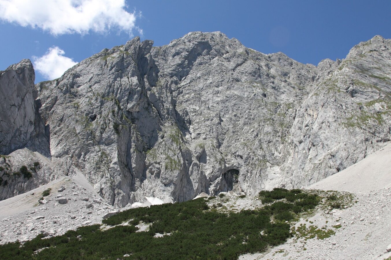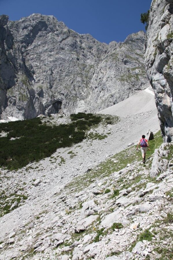 Am Fuße des Grimming Tors führt der Weg berhauf und bergab am Grimming-Südhang entlang. Es folgt ein anspruchsvoller Abstieg zum Grimming Wanderweg (Nr. 681). Dort geht`s dann bergab zur Grimming Hütte. Von hier den Weg Nr. 20 nach Niederstuttern oden den Weg Nr. 681 bergab zum Schloss Trautenfels foglen.