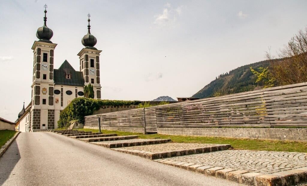 Am Ende der Siedlung folgen wir den Schildern der Fortstraße bergauf weiter durch den Wald, queren Forststraßen, bis wir wieder in bewohntes Gebiet kommen und einen ersten Blick auf die Wallfahrtskirche Frauenberg erhaschen.