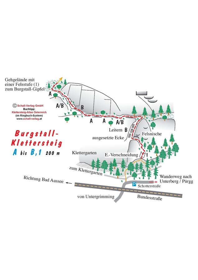 Auf der B 320 bis Trautenfels dort in den Kreisverkehr einfahren und die Ausfahrt B 146 in Richtung Salzkammergut nehmen. Nach 500 Meter links zur Ortschaft Untergrimming abbiegen. Gleich nach der Ortseinfahrt rechts einer Zufahrtsstraße folgen (Beschilderung: "Klettergarten).