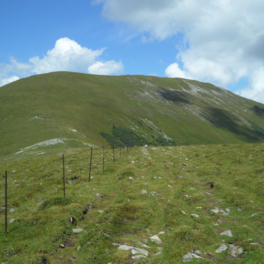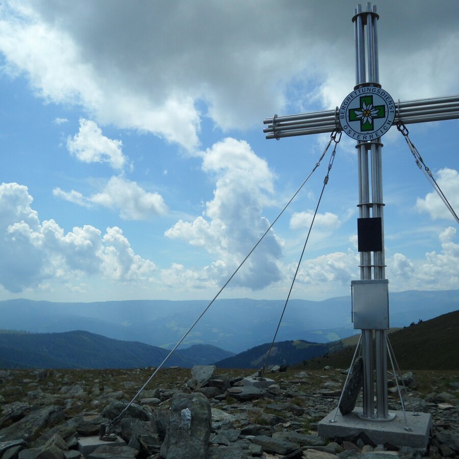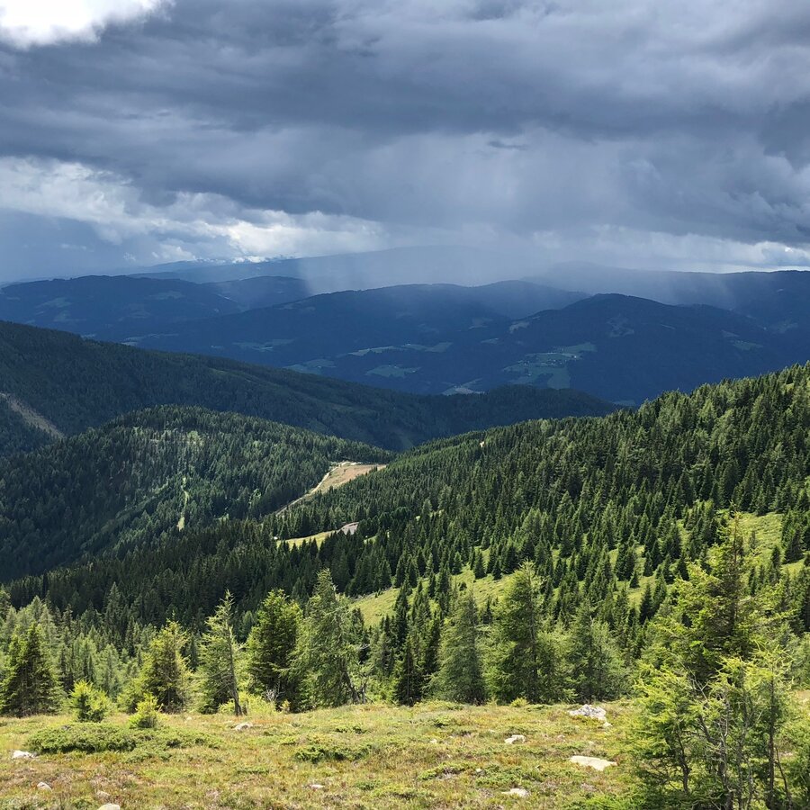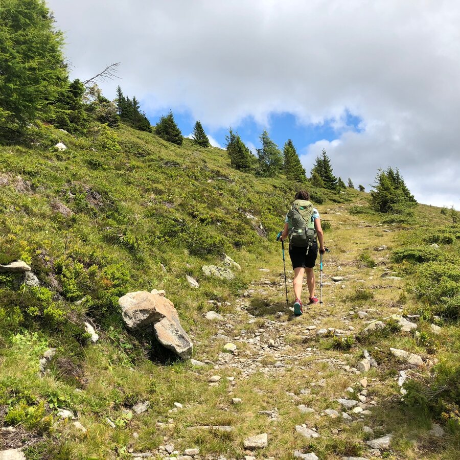 Wenige hundert Meter nach der Weißensteinhütte gelangen wir zu einer Wegkreuzung, wo wir den Steirischen Landesrundwanderweg verlassen und uns links halten um auf den 1.993 m hohen Speikkogel zu gelangen, dem wahrscheinlich schönsten Aussichtspunkt zwischen dem Zirbenland und der im Osten angrenzenden Lipizzanerheimat. Von nun an geht es die restlichen rund 3 km unserer Tour bergab. Vom Speikkogel weiter Richtung Osten gelangen wir bald auf den Nord-Süd Weitwanderweg 05, dessen Abschnitt hier auch die Via Alpina darstellt.