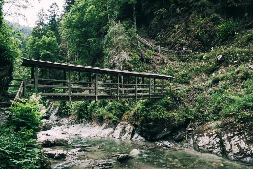 Ein Blick nach oben reicht, um die Flechten zu sehen, die gelb vom Felsen leuchten. Weiter geht’s zum Steg, die Stufen hinauf und hinab, bis zur Klammsteigruhe. Hier unbedingt innehalten, bevor du nach dem „Tunnel“ wieder bergauf gehst. Oben bei der Lichtung angelangt, steht eine Bank zur Rast bereit. Dem Wegweiser folgend geht es wieder über Wald und Wiese bis zur Straße. Hast du diese überquert, folgst du dem Forstweg wieder zurück zum Ausgangspunkt. Am eben verlaufenden Stück des Forstweges die Seele baumeln lassen, einen Blick auf die Bergbauernhöfe gegenüber werfen, die absolvierte Strecke Revue passieren lassen und sich einfach nur freuen!
