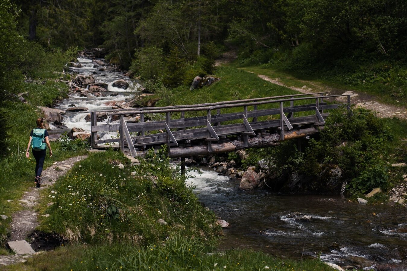 TAUSEND GRÜNTÖNE werden dir hier zuteil, wenn du dem plätschernden Bach entlang, durch Wald und über Brücken wanderst. Aus dem letzten Waldstück raus, öffnet sich dir die weite Almlandschaft und du kannst die bewirtschafteten Hütten schon sehen. Hier sind alle happy - Kühe, Schweinderl, Hasen. Und die Sennerin? Die serviert dir die feinsten Almschmankerl.