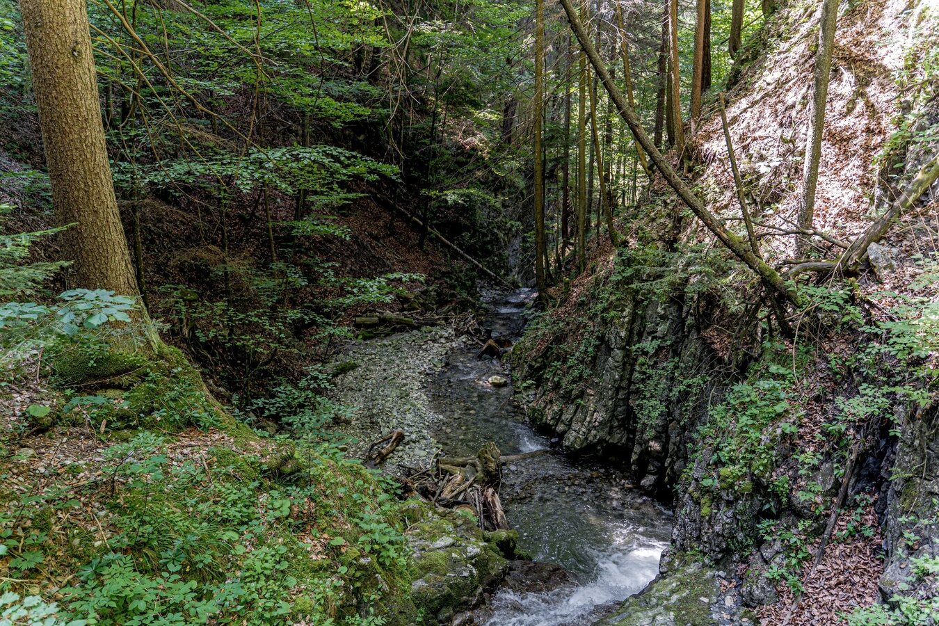 Vom Parkplatz im Ortsteil Lessern in der Gemeinde Stainach-Pürgg beginnt dein Spaziergang in Richtung eines versteckten Naturjuwels. Gleich zu Beginn passierst du das kleine Feuerwehrdepot und verlässt schon bald die Asphaltstraße, wo du unter einer Brücke hindurch wanderst und der Beschilderung in den schattigen Hochwald folgst.