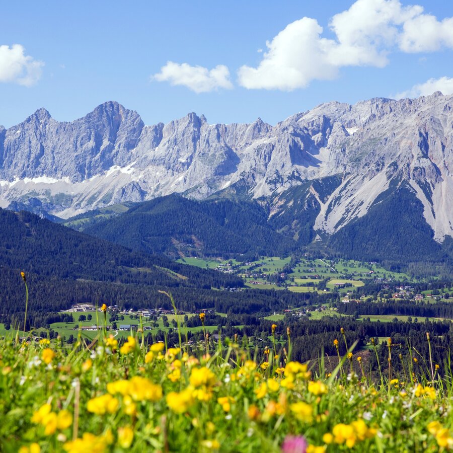 Ausgehend von Mandling, beginnt der erste Tag des Weges rechts der Enns mit einer leichteren Tour. Wir wandern in relativ kurzer Zeit von Mandling über den Vorberg auf das weite Hochplateau der Ramsau. In Richtung Osten mit Blick auf die mächtigen Felswände des Dachsteinmassives und die unzähligen Berggipfel der Schladminger Tauern.