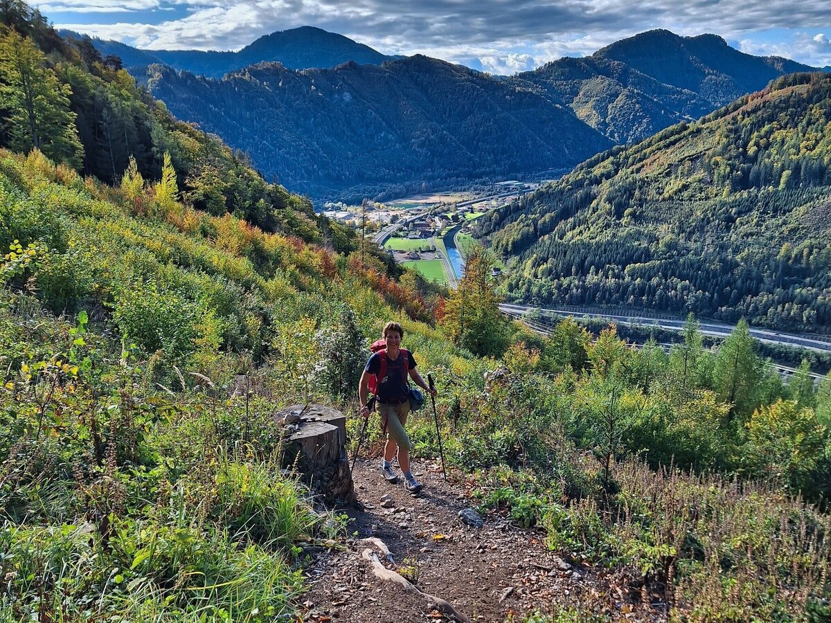 - Wir wandern steil bergauf, teilweise durch den Wald, mit Blick in das Murtal
