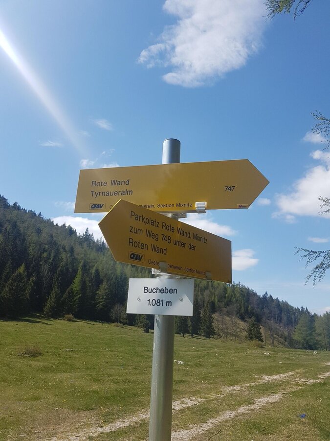 - Wir starten beim Bahnhof Mixnitz und orientieren uns an dem gelben Wegweiser in Richtung Rote Wand (Weg-Nr. 747)