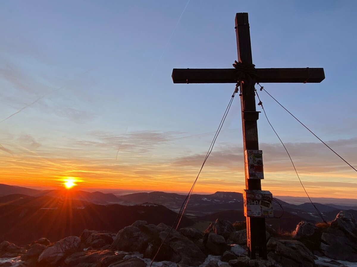 - Oben angekommen, erreichen wir das Gipfelkreuz auf der Roten Wand