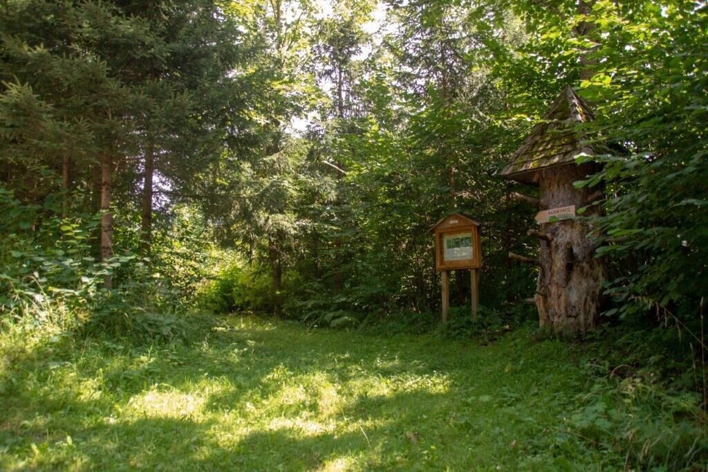 Gleich nach dem Parkplatz links in den Wald. Hier geht man einige Minuten an Tafeln und Pflanzen bis zum Schloss.