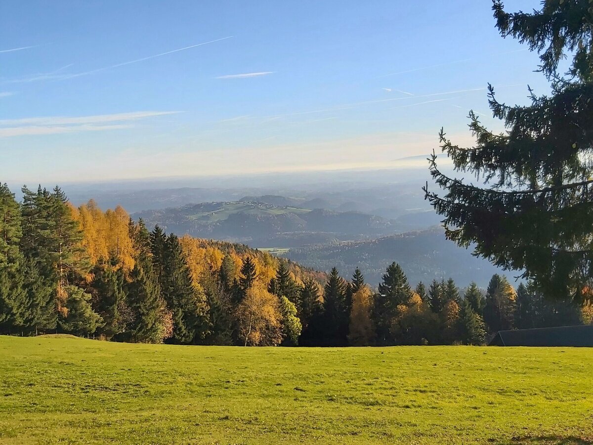 • Dort biegen wir scharf links ab und gehen am Wirtschaftsweg weiter. Ab jetzt geht der Blick in Richtung Norden, wir sehen den Kulm, die Stadt Weiz mit Raas und Zetz und auch schon den Patscha.