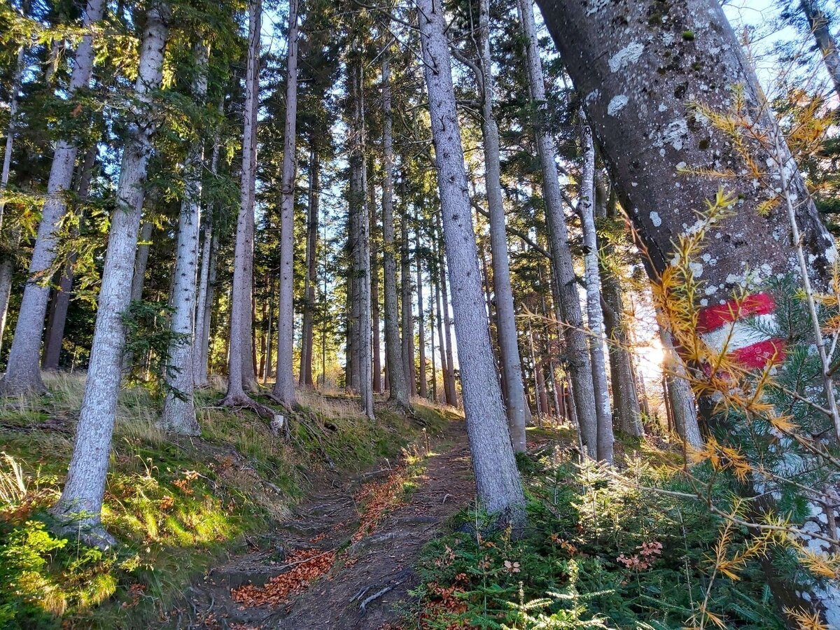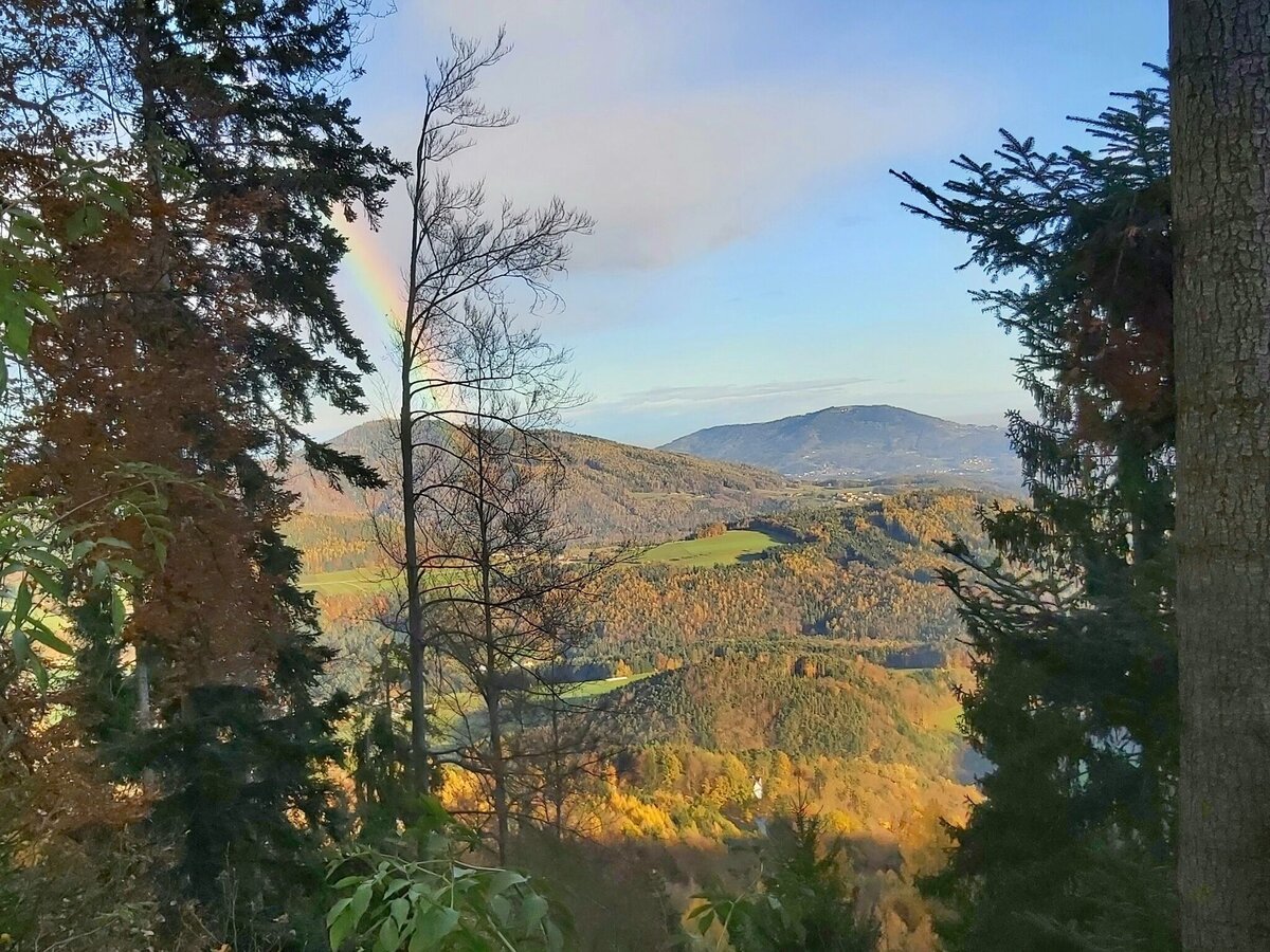Der etwas steilere Anstieg hinauf zum Gipfel führt durch einen schönen Mischwald, nach einer Rast beim nett gestalteten Gipfelkreuz geht es gemütlich hinunter bis zum Hochwarter Kreuz. Die restliche Wegstrecke führt um den Berg herum zurück nach Gschaid, jetzt aber mit großartigen Ausblicken auf das Weizer und Grazer Bergland und zurück nach Weiz.
