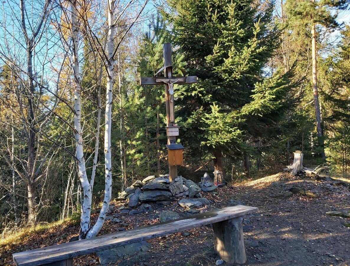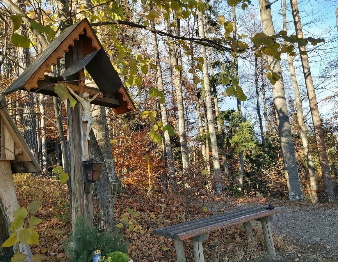 • Beim Gipfelkreuz im Wald gibt es nicht nur Rastbänke, sondern auch ein Gipfelbuch.