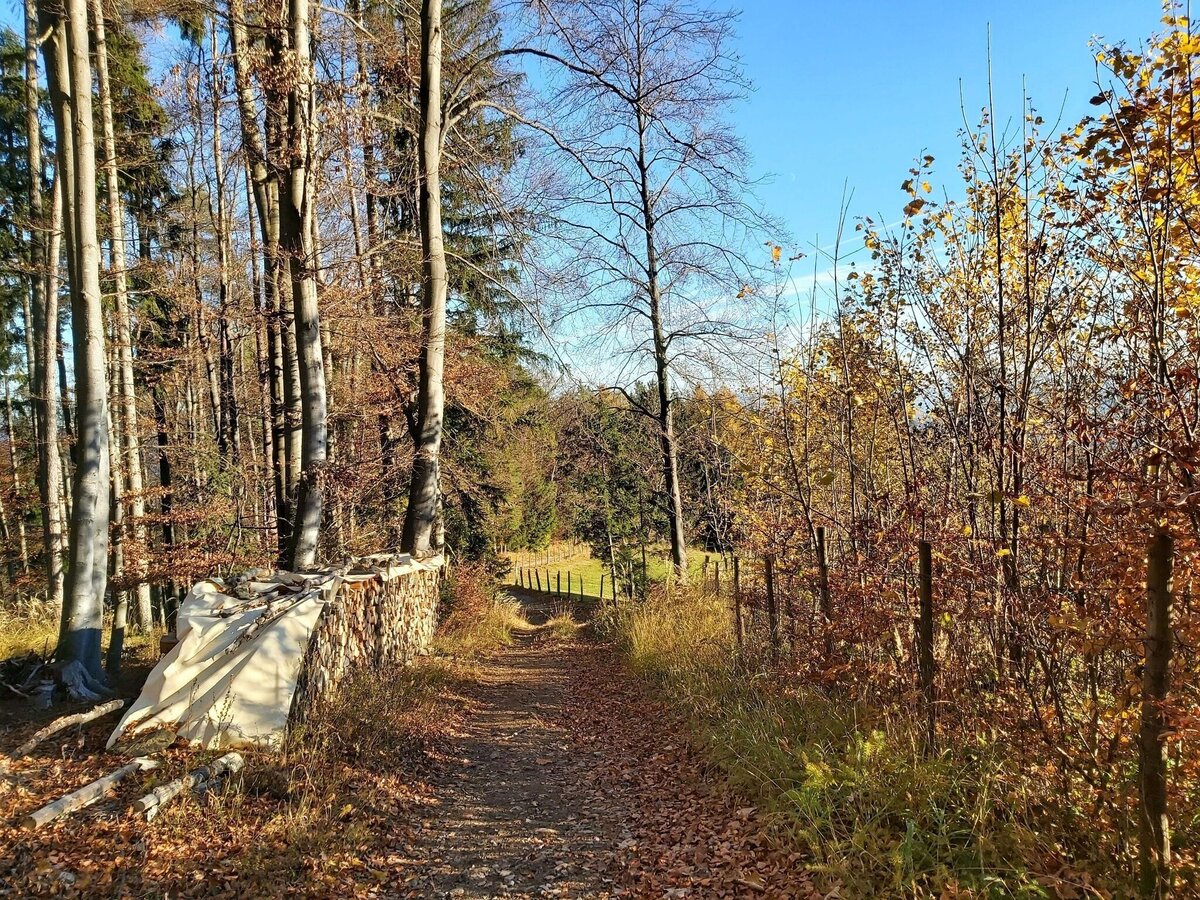 • Wir starten bei der Markierung „Strosser/Weg-Nr. 4“ und gehen links hinauf in den Wald.